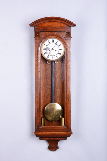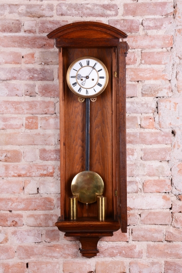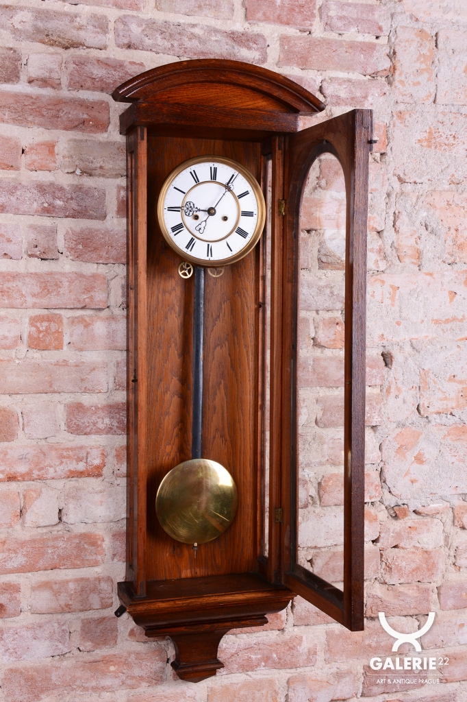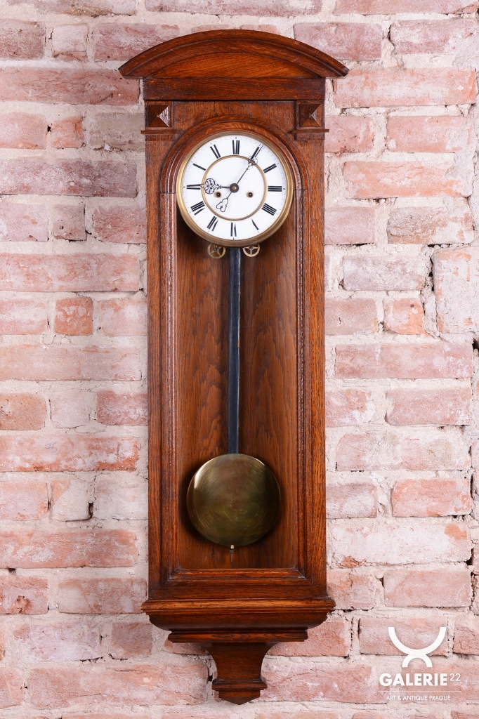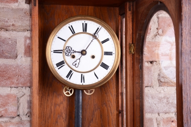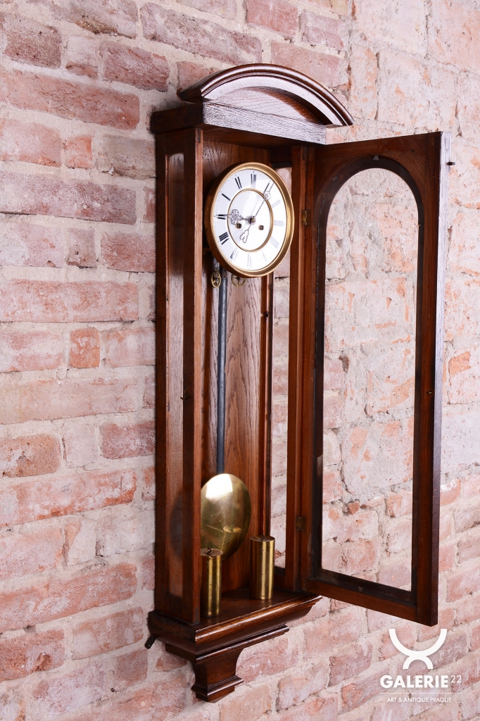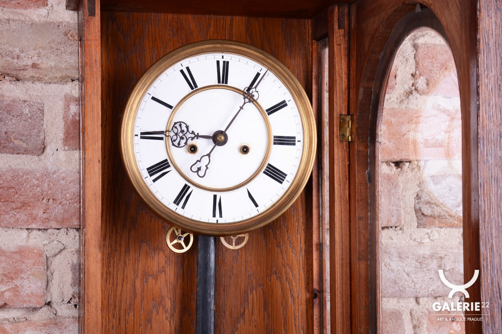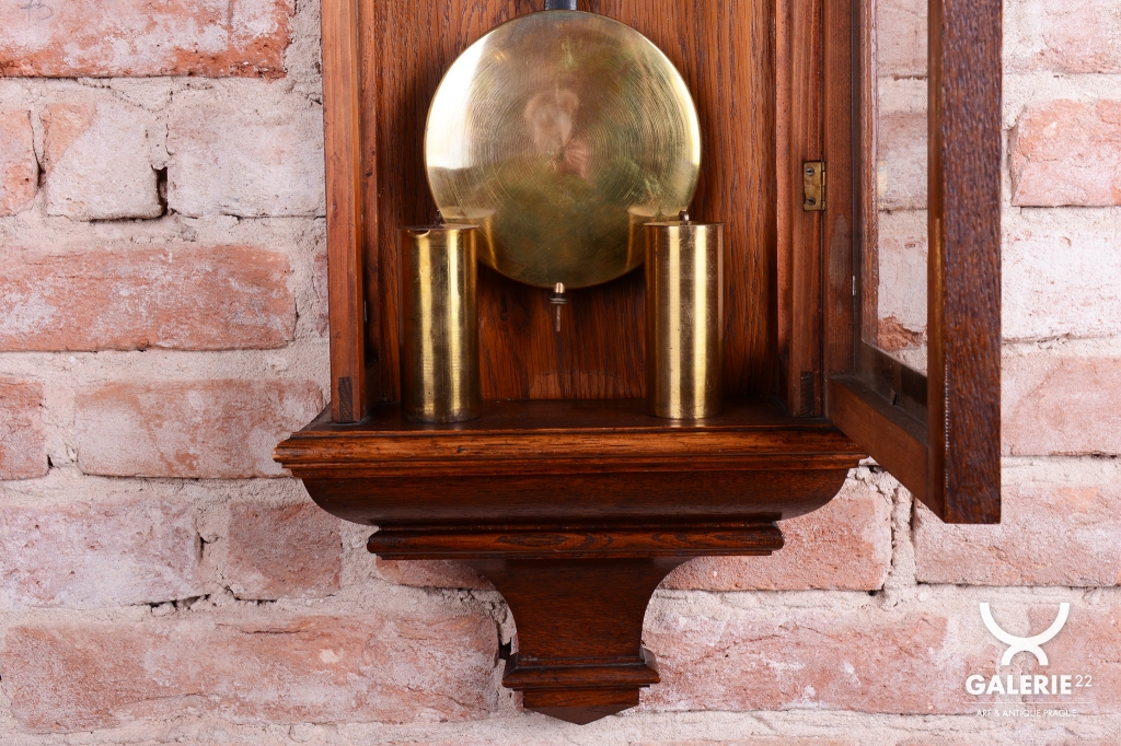 Doba chodu - týdenní - 1/2 - odbijí každých 30 min. Dvou-závažové hodiny. Ciferník smalt. Mosazný rámeček, závaží a kyvadlo.