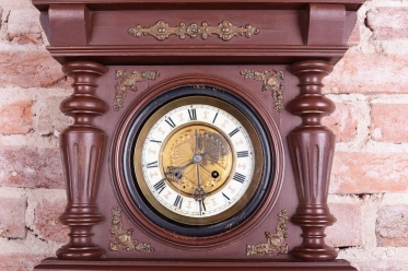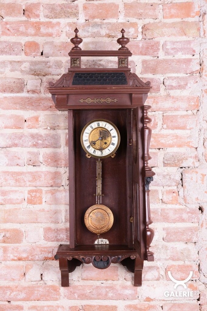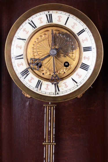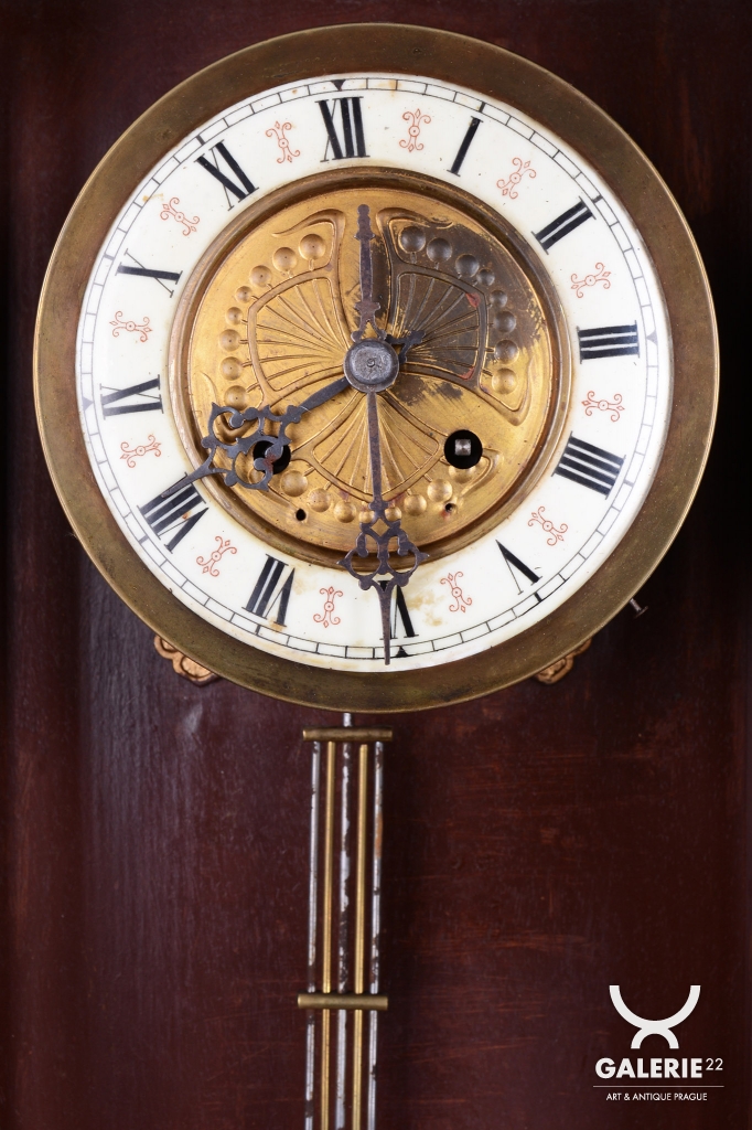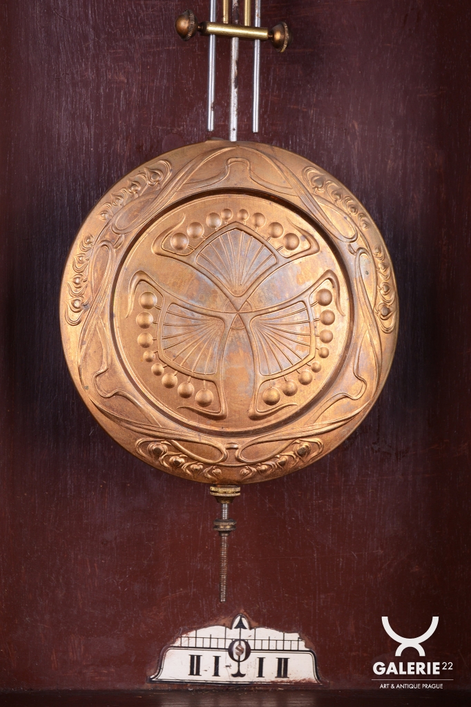 Ozdobně tlačené kyvadlo a ciferník v kombinaci se smaltem a cizelované ozdoby vše mosaz.