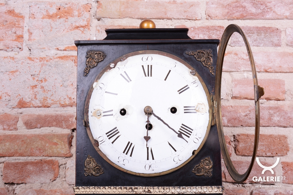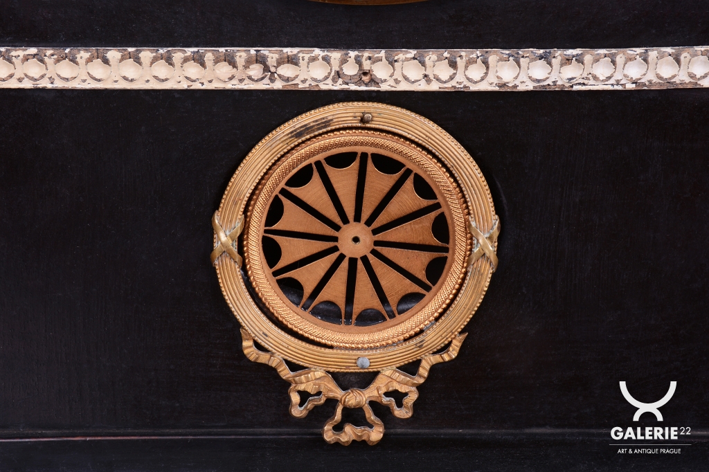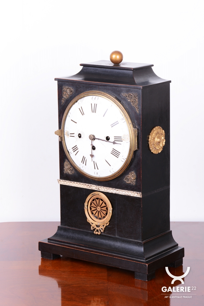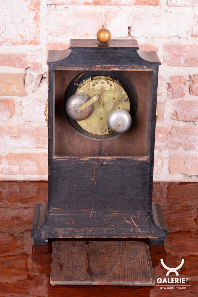 Pérové-natahují se klíčkem, chod 3-5 dní. Čtvrťové bití - 1/4 - zvonečkové bití, odbijí každých 15 min. Zvonečkové bití, do dvou zvonků. Cizelované zdobení - mosaz. Velký ciferníky - smalt.