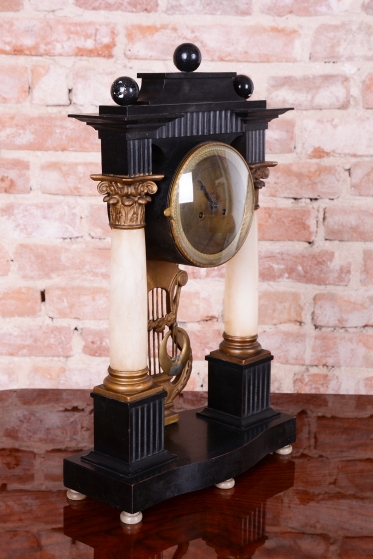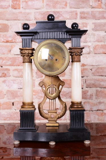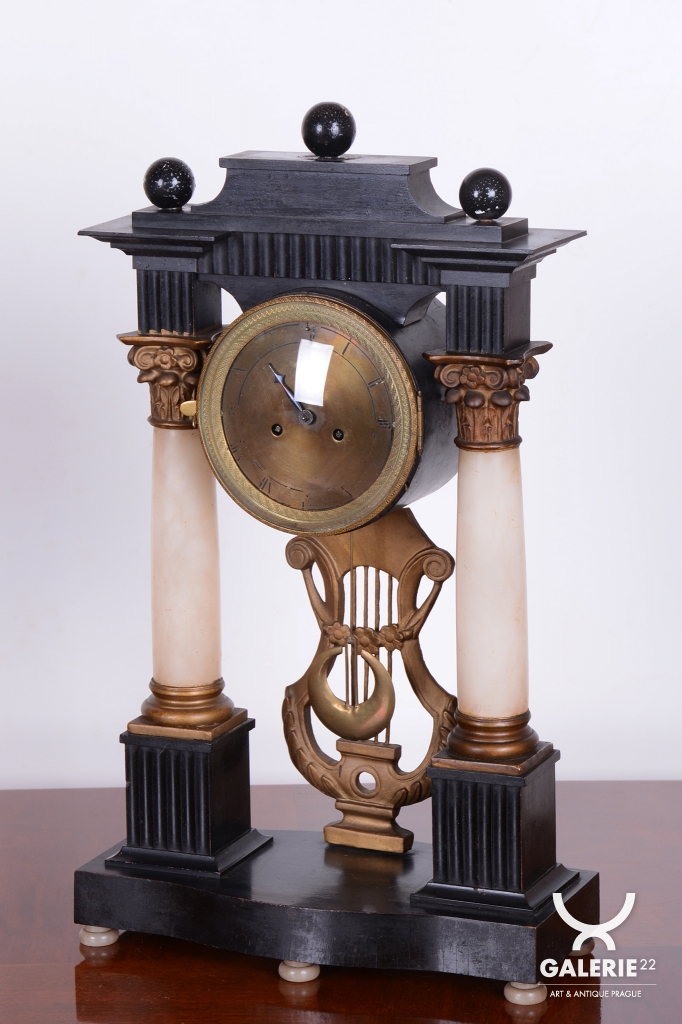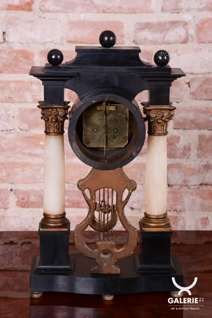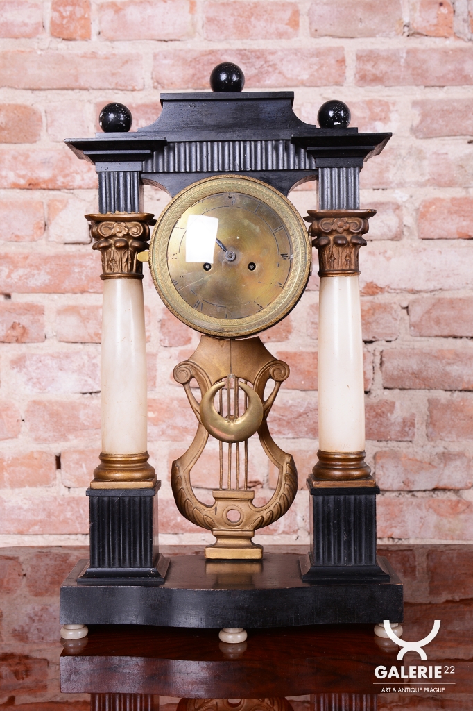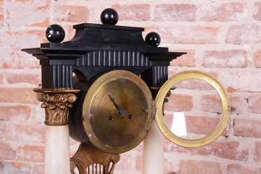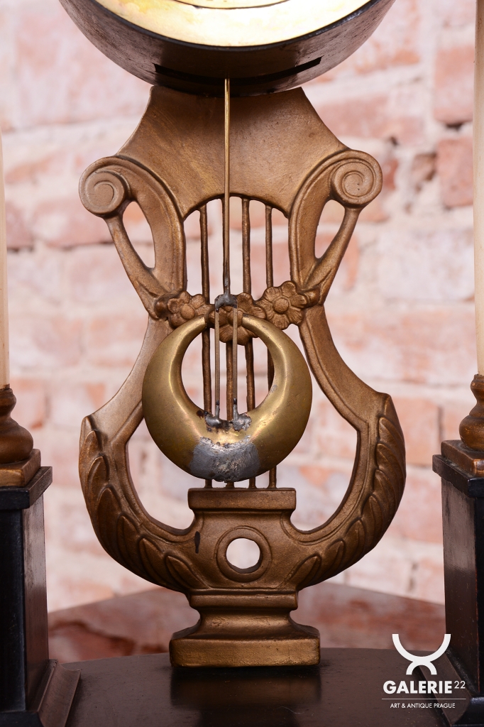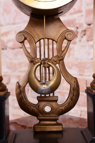 Lyra zavěšená pod ciferníkem nebo korintské hlavice - zdobné hlavice sloupů - polychrom - zlacené.