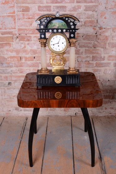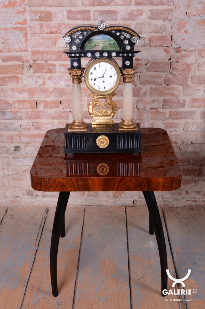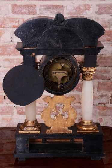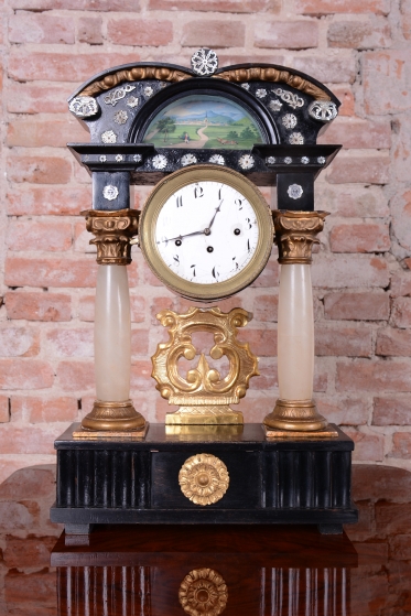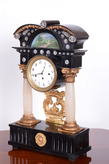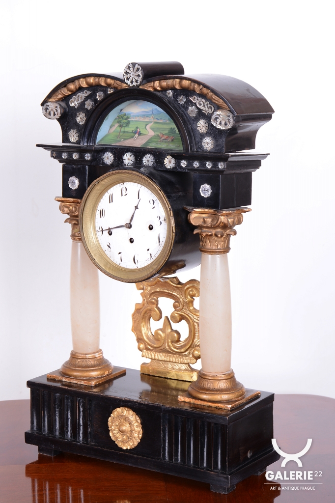 Celek vytváří dojem architektonického oltáře nebo chrámu, s nejvýraznějším dekorativním prvkem, kterým je miniaturní ruční malba, umístěná v horní části hodin.