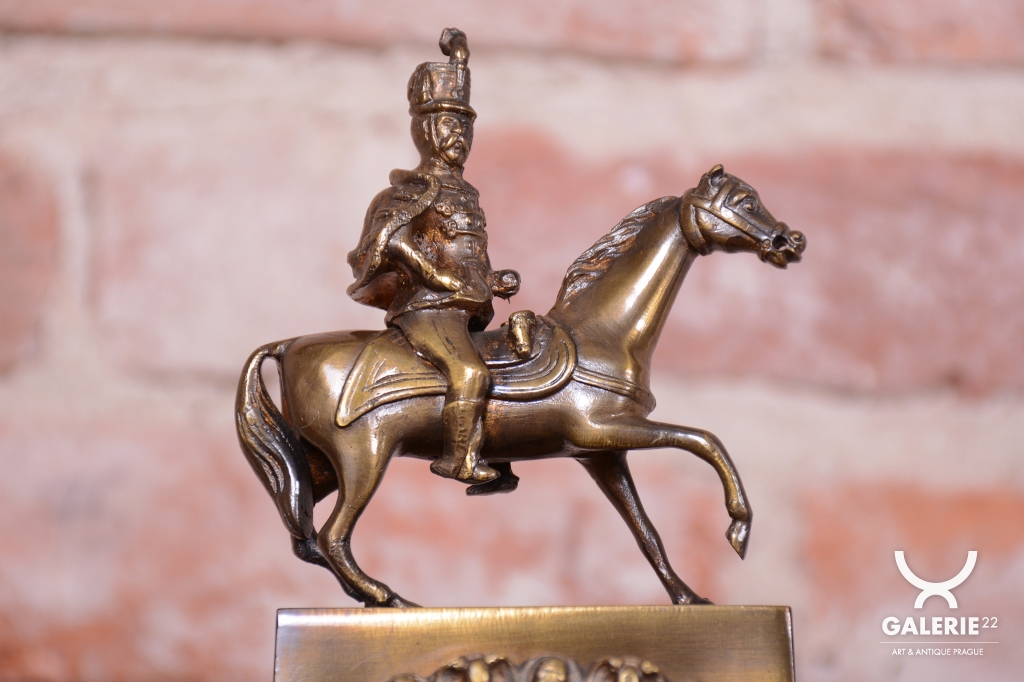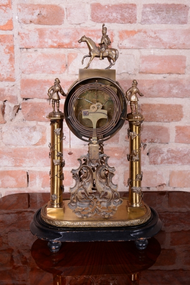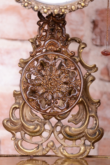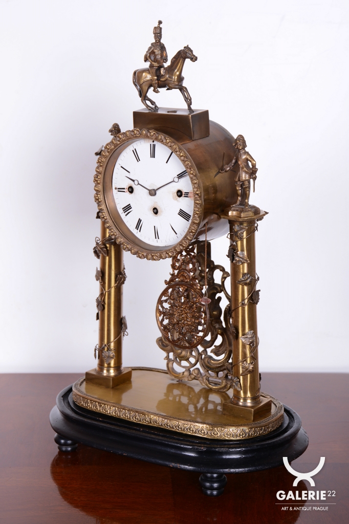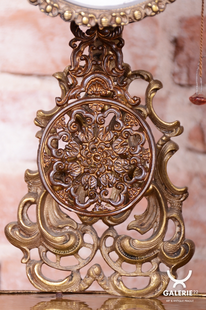 Celé tělo hodin je bohatě zdobeno v ohni zlacená mosaz.