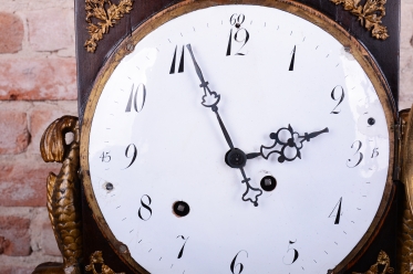 Cizelovaný mosazný rámeček, ozdoby a kyvadlo.