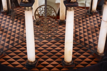 Šachovnicová intarzie: Podlaha portálu je intarzovaná dvoubarevnou dřevěnou kontrastní šachovnicí, což vytváří silný perspektivní efekt hloubky.