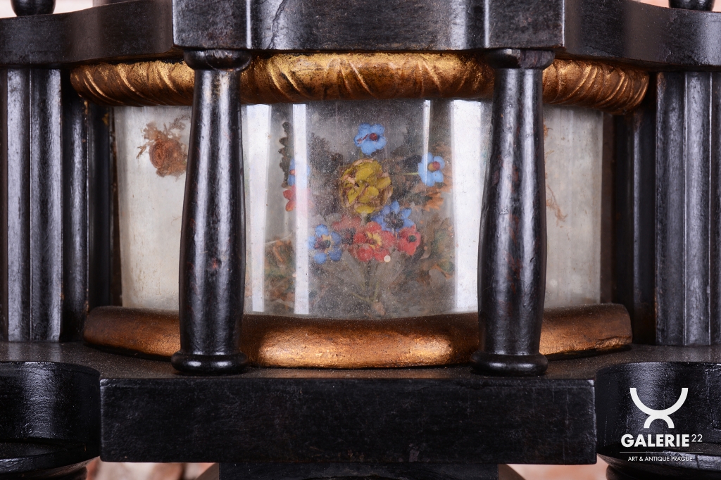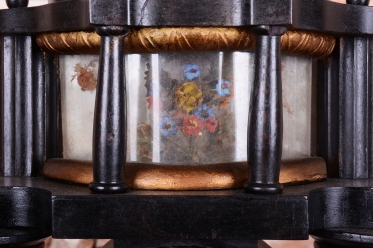 Rámeček uprostřed horní části (nad ciferníkem) je miniaturní diorama / scénka: Jedná se o malou dekorativní vitrínu, kde jsou umístěny drobné trojrozměrné dekorace (květiny, lístky, keře), často vyrobené z kusu mušle, vosku, hedvábí nebo papíru a případně dobarvené. Tento prvek slouží k rozptýlení a je typickým intimním dekoračním prvkem biedermeieru, který kladl důraz na domácí a citové hodnoty.