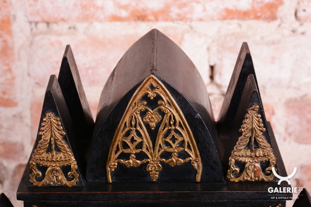 Atypický tvar horní římsy imitující věže a počtem sloupů z alabastru.