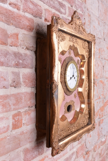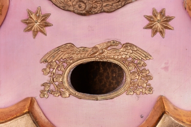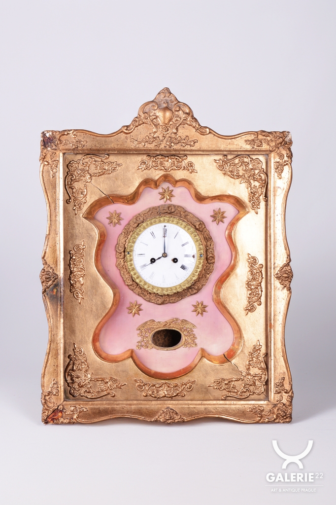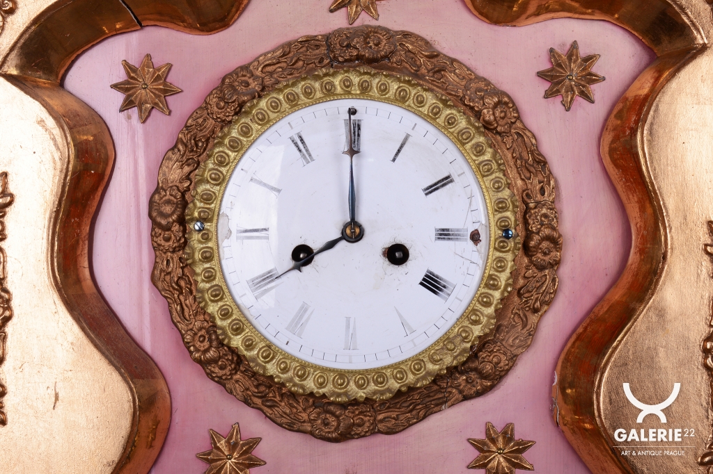Věnec: Ciferník je vsazen do velkého, kruhového, bohatě reliéfního věnce ve tvaru slunce,(slunce jako symbol monarchie/síly).