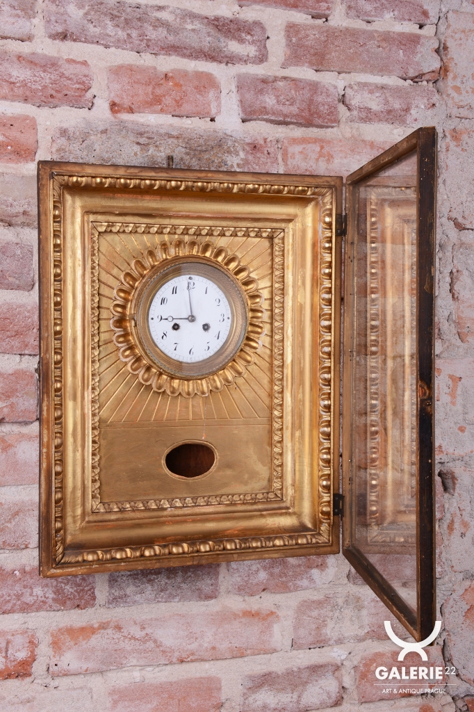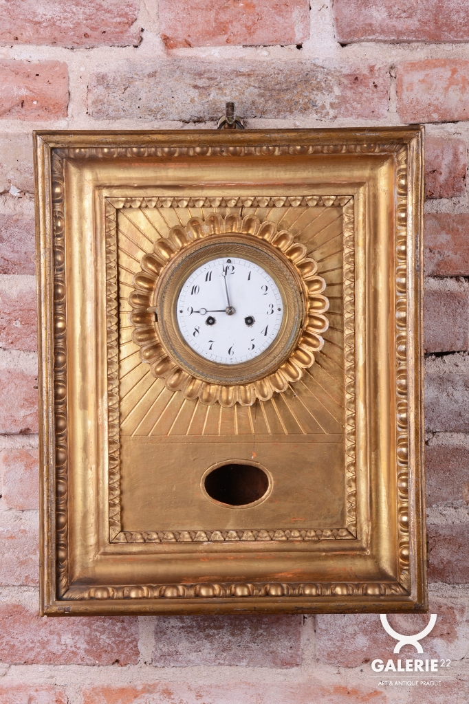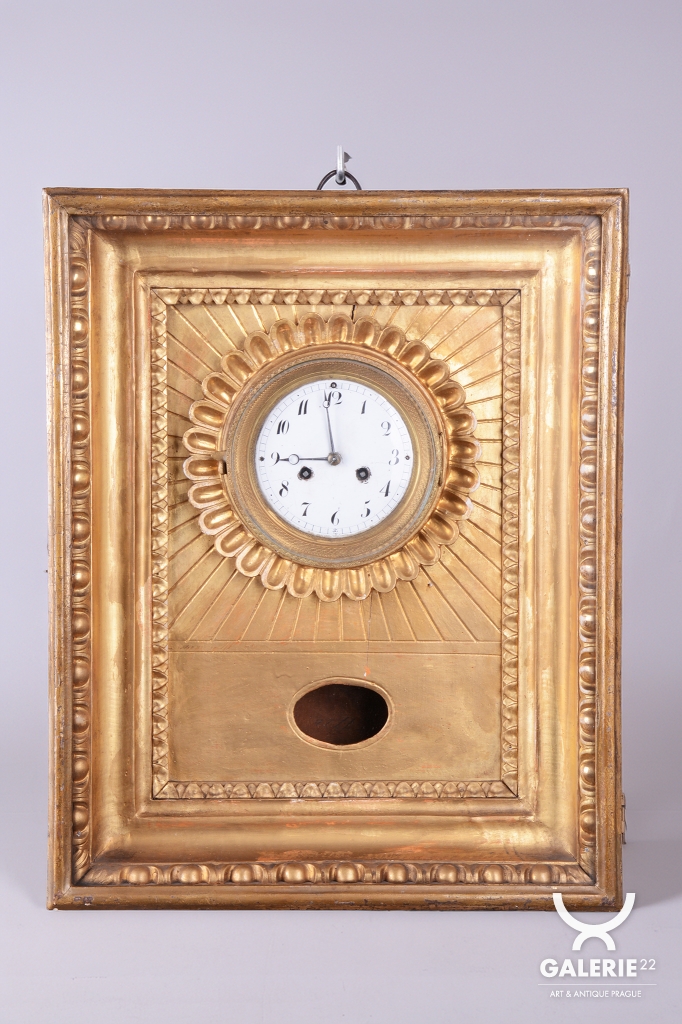 Věnec: Ciferník je vsazen do velkého, kruhového, bohatě reliéfního věnce ve tvaru slunce, (slunce jako symbol monarchie/síly).