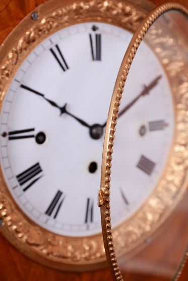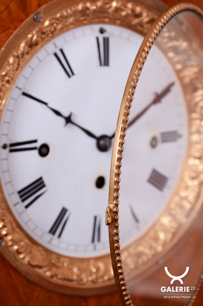 Ciferník smalt s litým věncem v mosazném rámečku.
