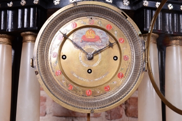 Ručně malovaný, celo-mosazný ciferník s vnitřním datumovým věncem a cizelovaným rámečkem.