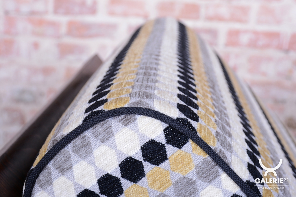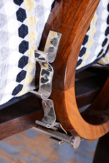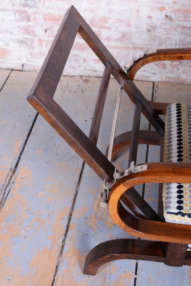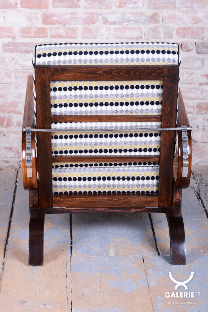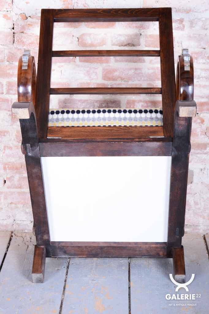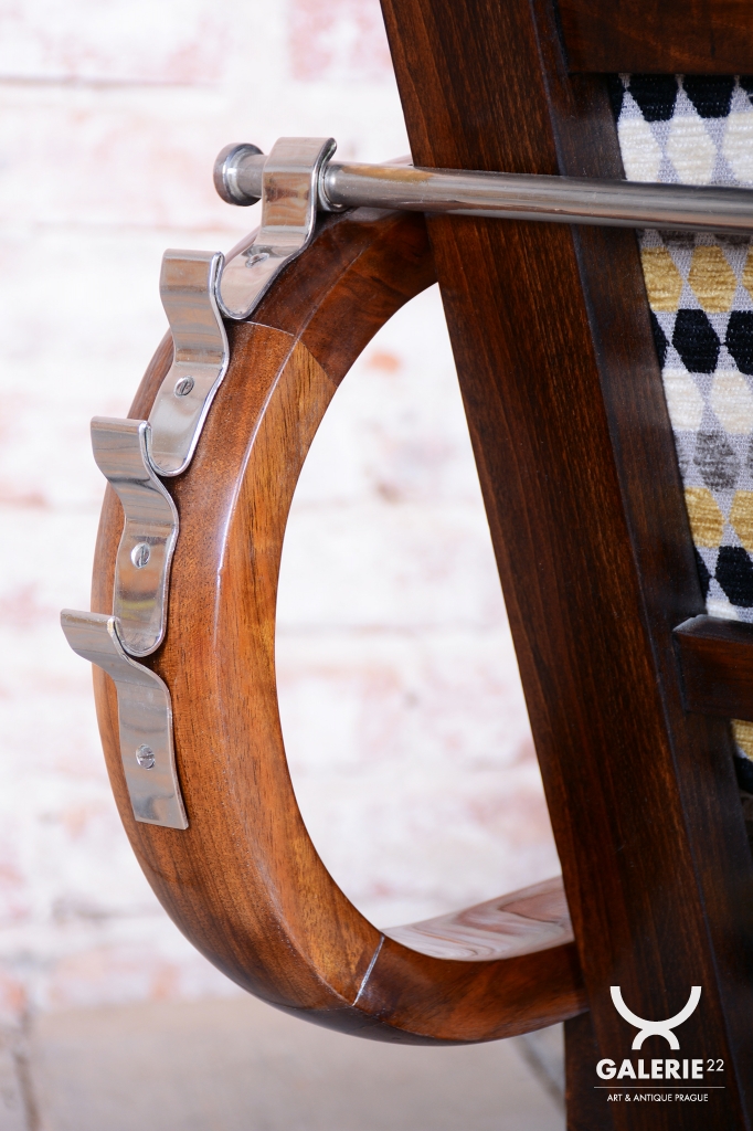 Křesla jsou zhotoveno z ořechového masivu a prošla důkladnou renovací do vysokého lesku, která podtrhuje bohatou kresbu dřeva a jeho noblesu. Díky nastavitelnému polohování opěradla je křeslo nejen stylové, ale i mimořádně pohodlné. Pro maximální komfort je nově odborně čalouněno za použití tradičních pružinových sedáků.