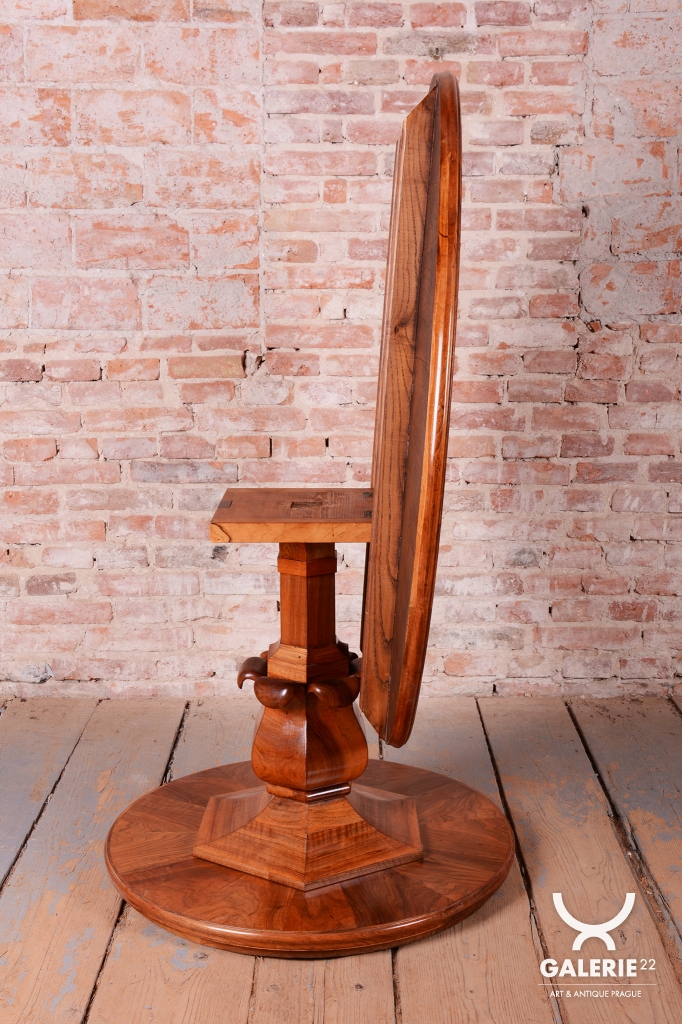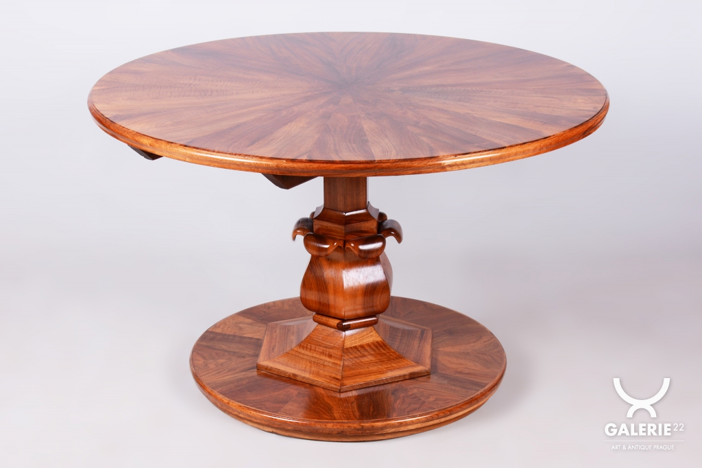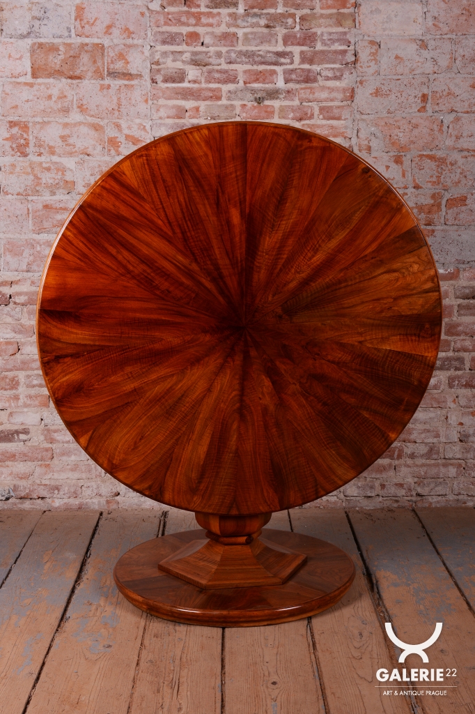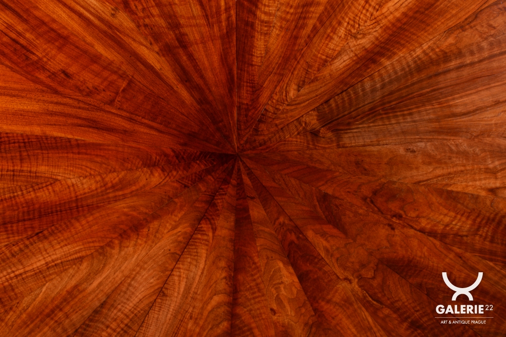 Stůl prošel precizním restaurováním, při kterém byla citlivě oživena původní politura dřeva. Dominantním prvkem je ořechová dýha s naprosto mistrnou skladbou, kde kresba dřeva vytváří fascinující symetrické obrazce. Tento detail svědčí o mimořádné zručnosti tehdejších mistrů dýhařů, kteří dokázali přirozenou strukturu dřeva povýšit na umělecké dílo. Robustní, a přesto elegantní podnož zajišťuje stabilitu a podtrhuje architektonickou čistotu celého kusu.