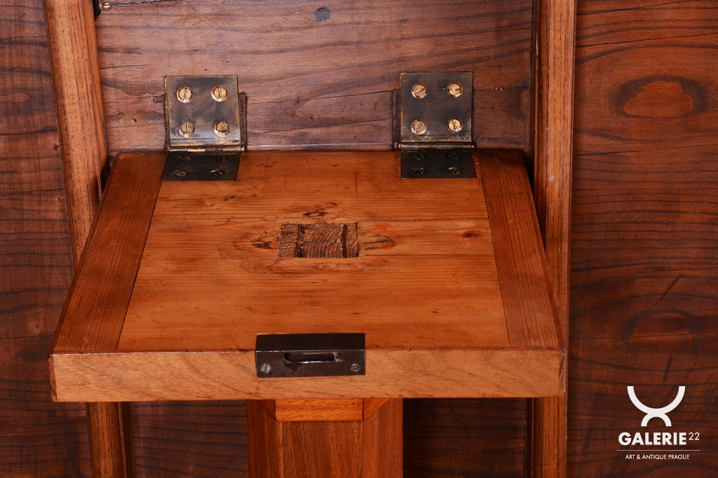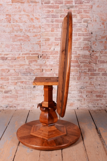 Tento jídelní stůl se sklopnou vrchní deskou je brilantní ukázkou rakouského nábytkářství z období Biedermeieru počátku 19. století. Jde o kus, který v sobě spojuje praktickou vynalézavost s estetickou vytříbeností – mechanismus sklopné desky umožňoval flexibilní využití prostoru v měšťanských salonech, zatímco jeho provedení reprezentuje vrcholné řemeslné umění své doby.