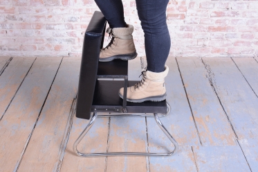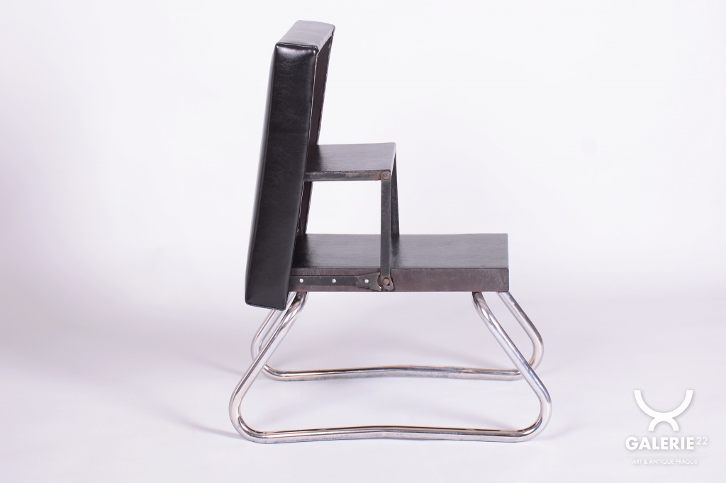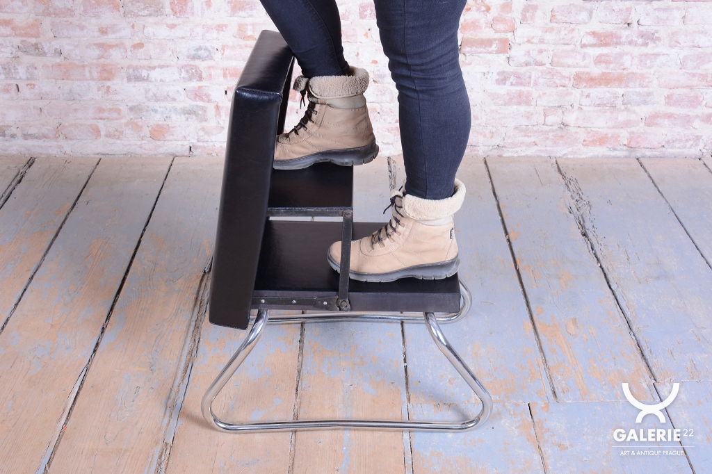 Taburet byl restaurován a je plně funkční – nejenže slouží jako stylové sedátko nebo podnožka, ale díky svému sklopnému designu se snadno přemění na praktické schůdky ke knihovně či jiným vyvýšeným místům.