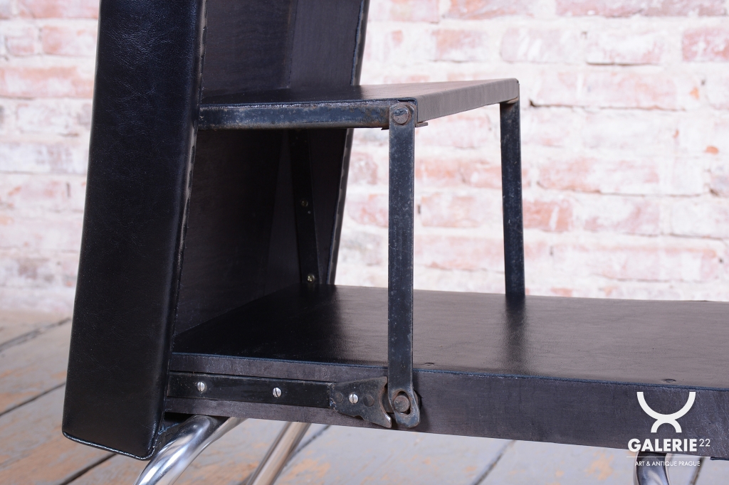 Tento inovativní a funkční taburet s možností přeměny na schůdky představuje fascinující designový prvek z přelomu stylů Mid-Century a Bauhausu, typický pro 60. léta a pocházející z Německa.