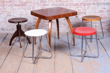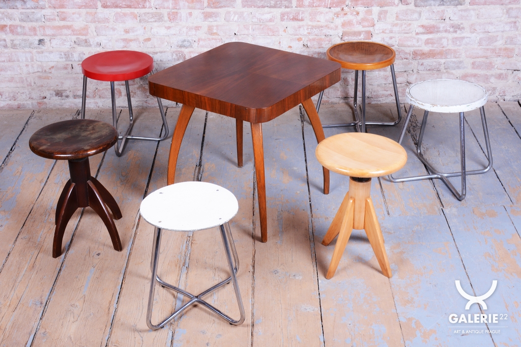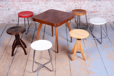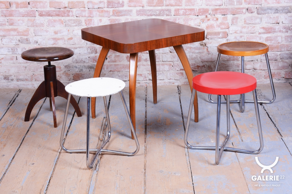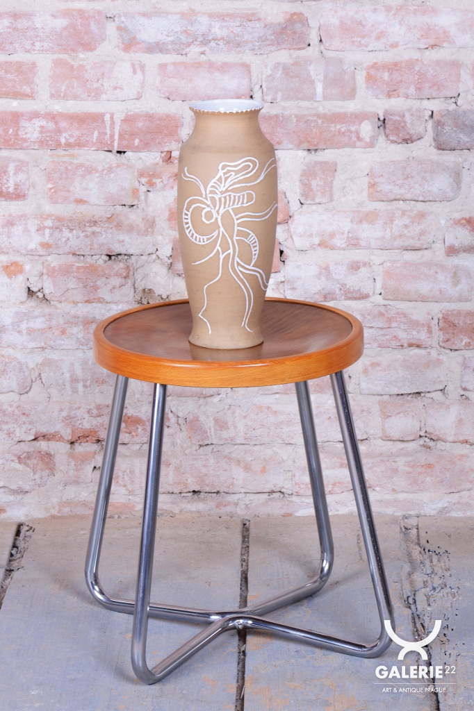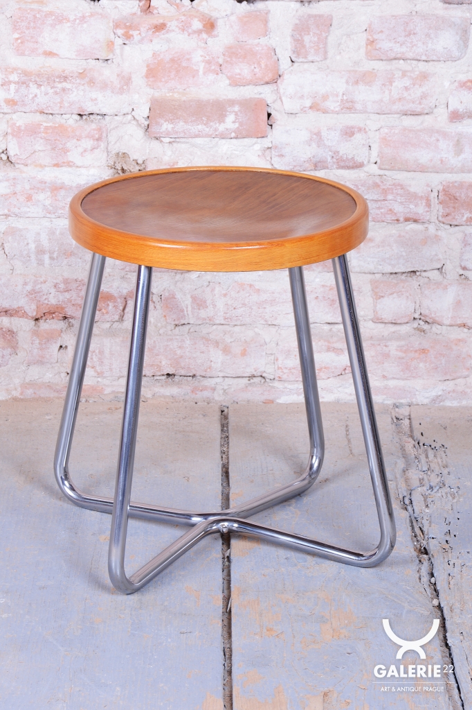 Tento ikonický taburet je špičkovou ukázkou funkcionálního designu školy Bauhaus v Československu. Byl vyroben ve 30. letech 20. století v proslulé továrně Mücke-Melder ve Fryštátě, která patřila k evropské elitě v produkci nábytku z ohýbaných ocelových trubek. Taburet vyniká puristickou formou a vysokou konstrukční kvalitou, která je pro tohoto výrobce příznačná.