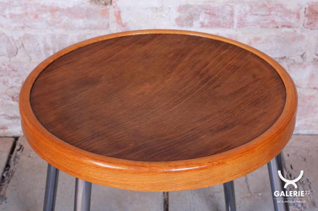 Kombinace materiálů sází na kontrast chladného kovu a hřejivého dřeva. Konstrukce z chromované oceli prošla v rámci restaurování profesionálním vyčištěním, čímž získala zpět svůj zrcadlový lesk. Sedák je vyroben z bukového masivu, u něhož byla citlivě oživená původní politura, aby vynikla přirozená kresba dřeva a zachovala se jeho historická patina. Tento taburet je nejen praktickým sedacím nábytkem, ale také vysoce ceněným sběratelským kusem, který reprezentuje moderní životní styl první republiky.