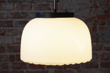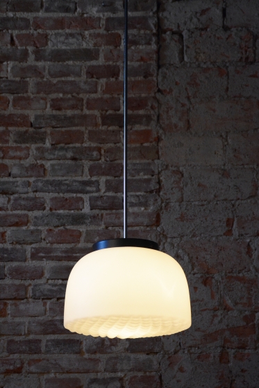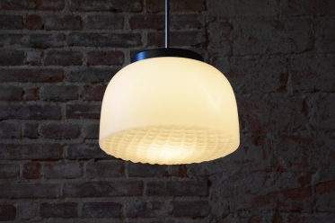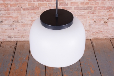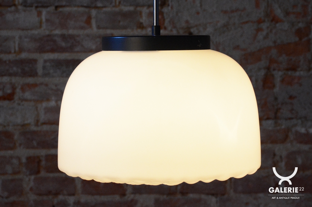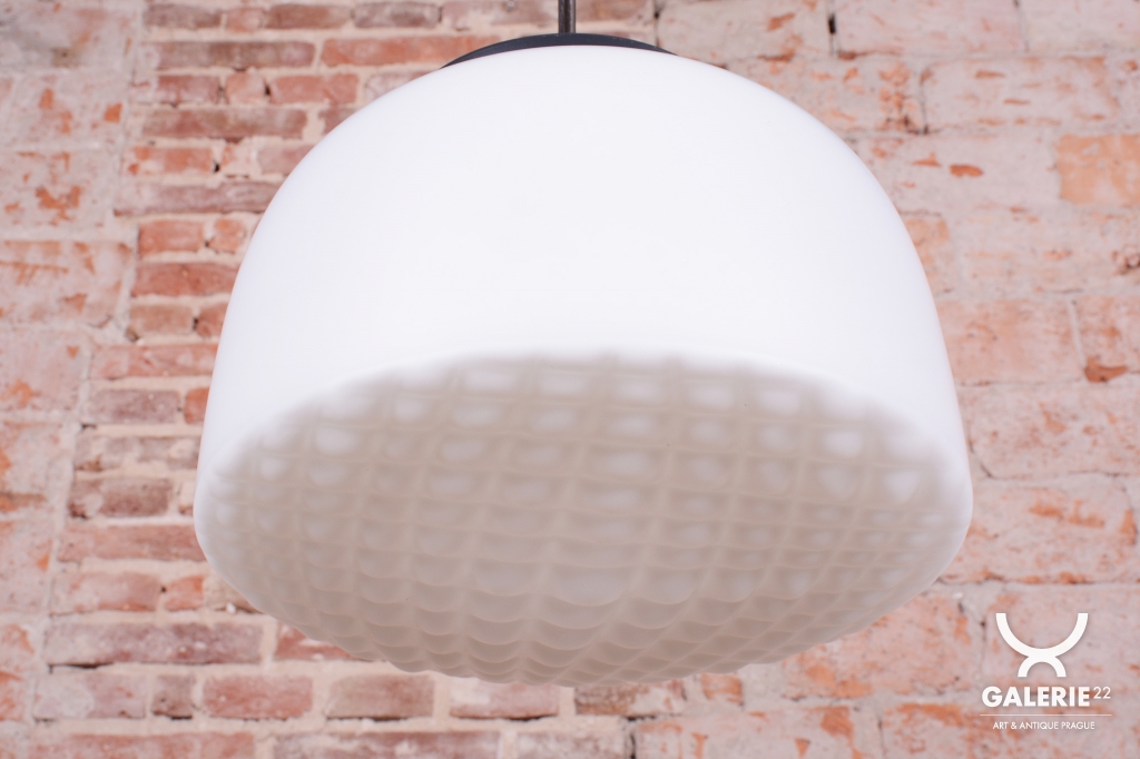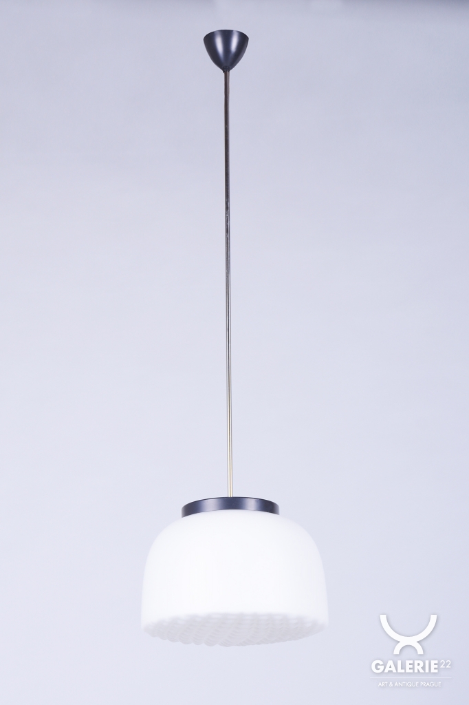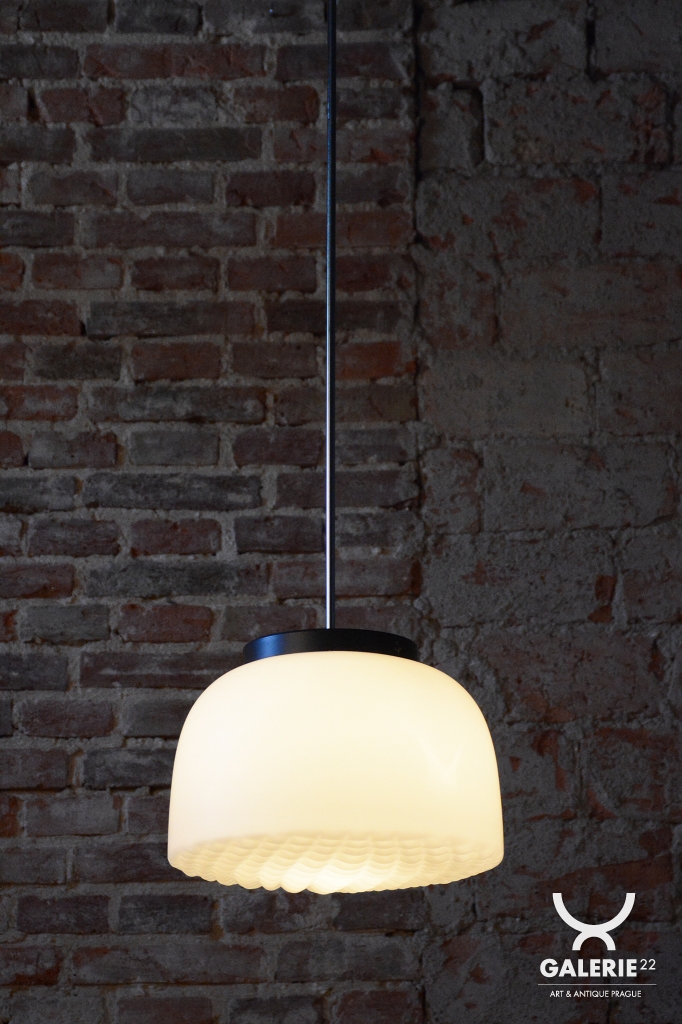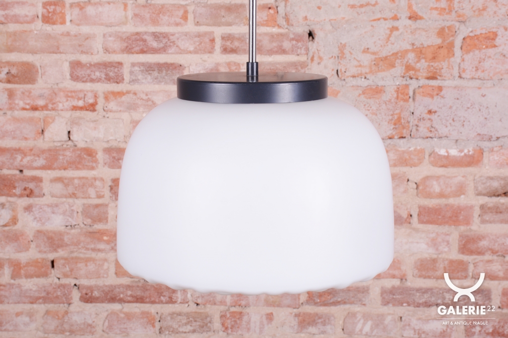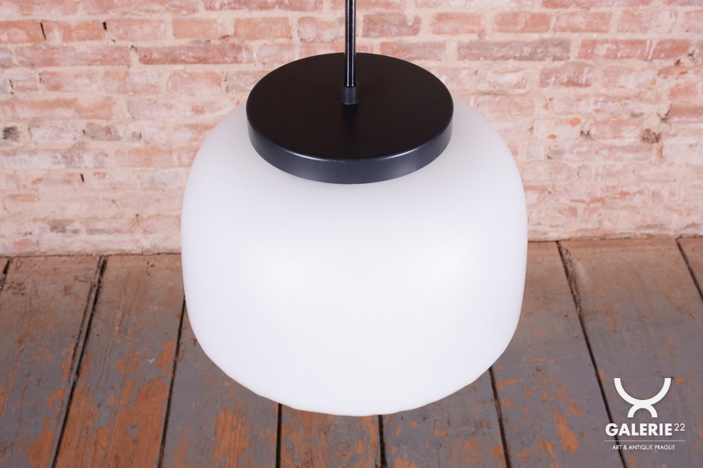 Tento nadčasový lustr je elegantním zástupcem bruselského stylu a estetikou Mid-Century modernismu, který v polovině 20. století proslavil Československo na mezinárodní scéně. Svítidlo sází na minimalistickou kombinaci materiálů a čisté geometrické tvary. Dominantou je velkorysé stínidlo z bílého opálového skla o průměru 35 cm, které v interiéru vytváří velmi měkké a harmonicky rozptýlené světlo bez oslnění.