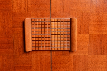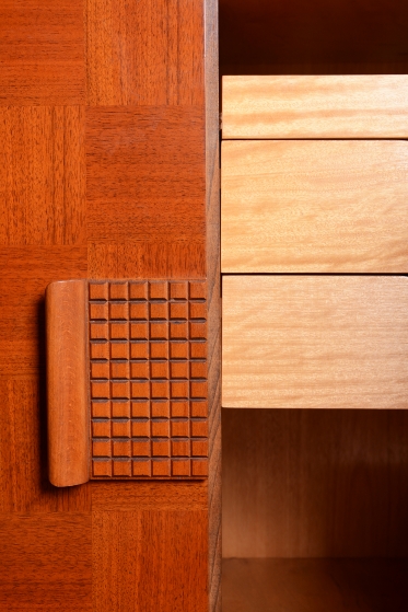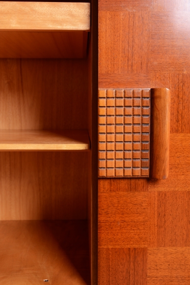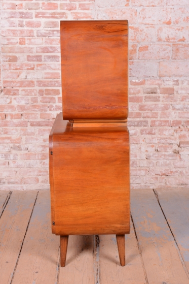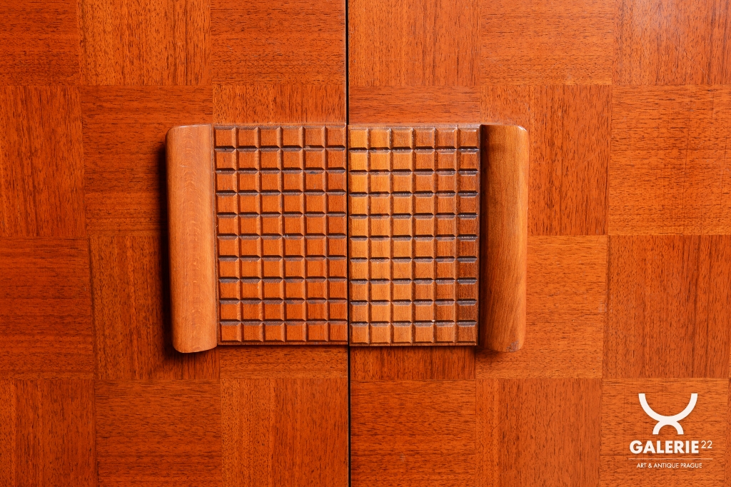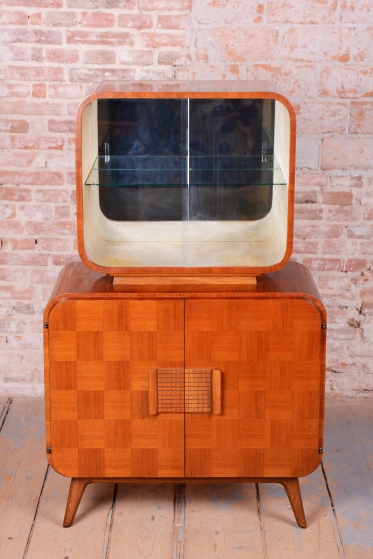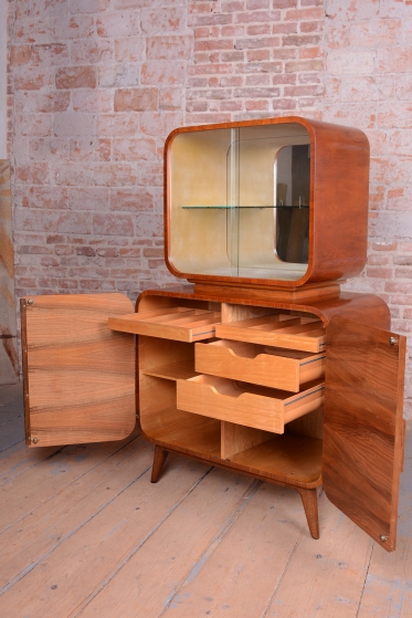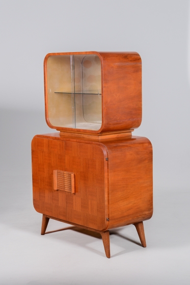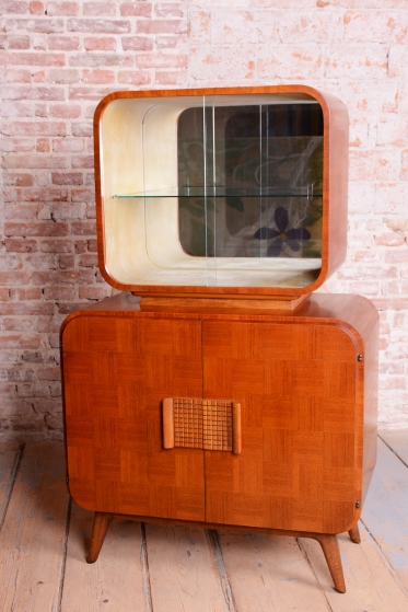 Předmět prošel odborným restaurováním. Korpus je vyhotoven z ušlechtilé mahagonové dýhy v kombinaci s bukem a sklem. Horní prosklená část s policí a vnitřním zrcadlem je ideální pro vystavení nápojového servisu či sbírky skla. Unikátním detailem je původní flokáž (semišový povrch) v odstínu jemné žluté barvy uvnitř vitríny, která je ve skvělém stavu. Spodní uzavřená část zaujme dekorativním šachovnicovým vzorem dýhy a celkový retro vzhled dotvářejí elegantní zaoblené nožky.