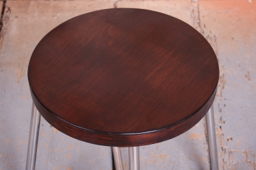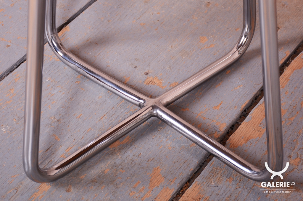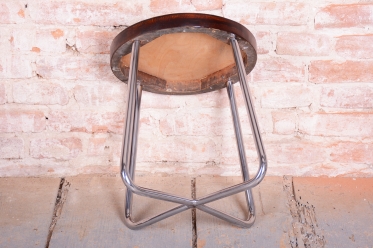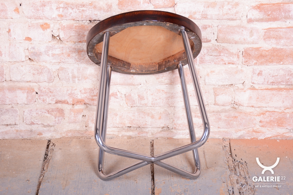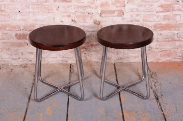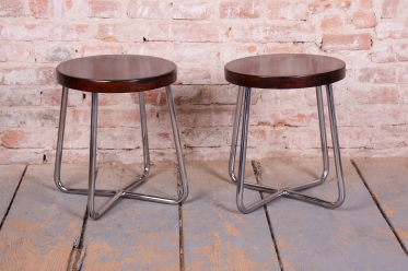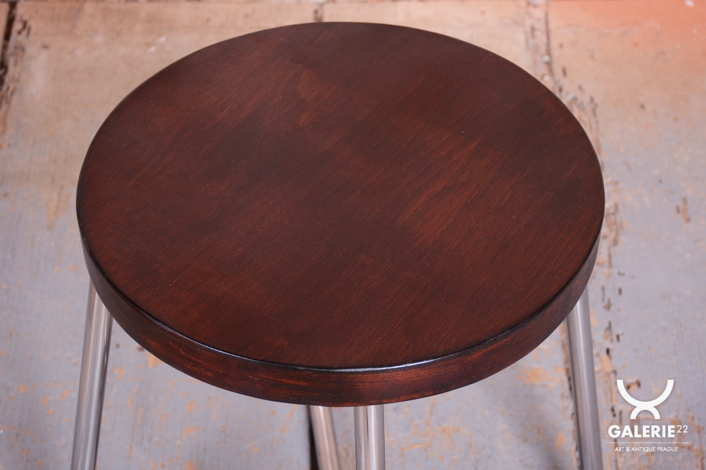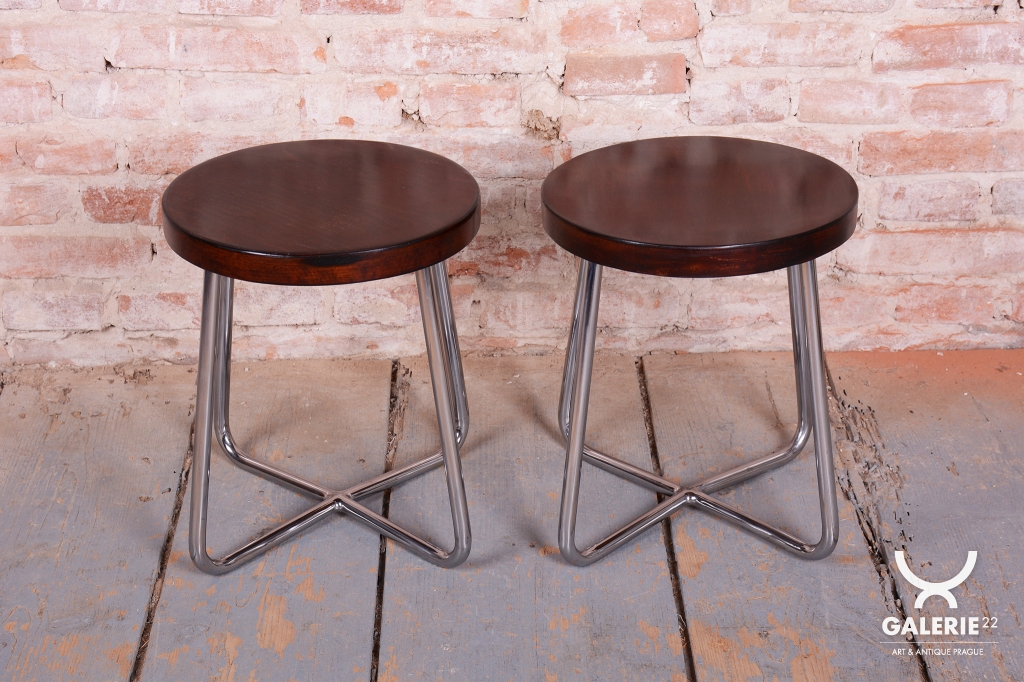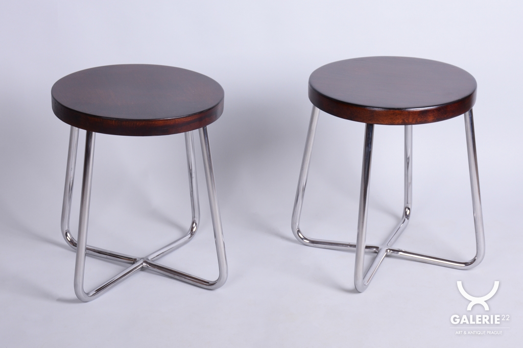 Pár prošel kompletním restaurováním. Trubková chromovaná ocel byla profesionálně vyčištěna, díky čemuž vynikají ikonické ohýbané linie rámu. Sedací plocha je tvořena bukovou překližkou v masivním bukovém rámu, což taburetkám dodává vysokou odolnost. Celá konstrukce je naprosto stabilní a pevná. Tyto taburetky jsou ideálním doplňkem pro milovníky industriální estetiky, kteří hledají autentický prvek české meziválečné avantgardy.