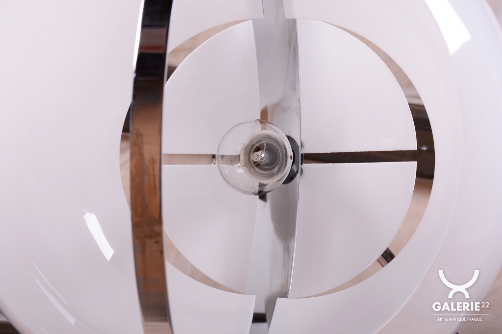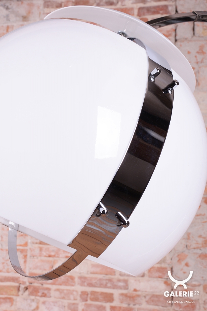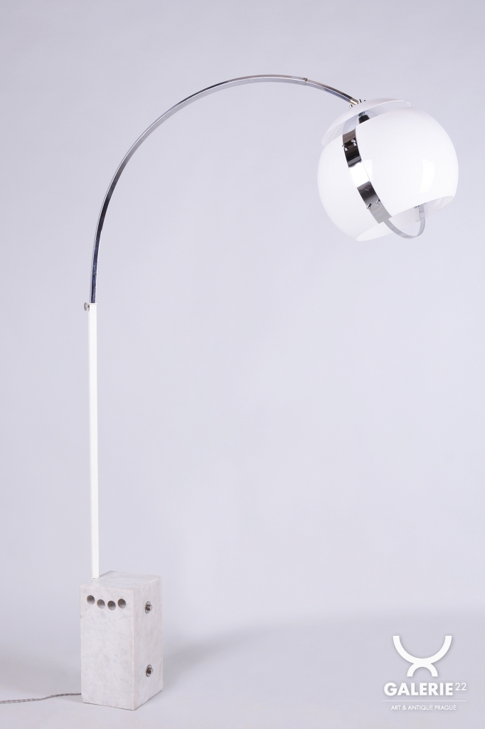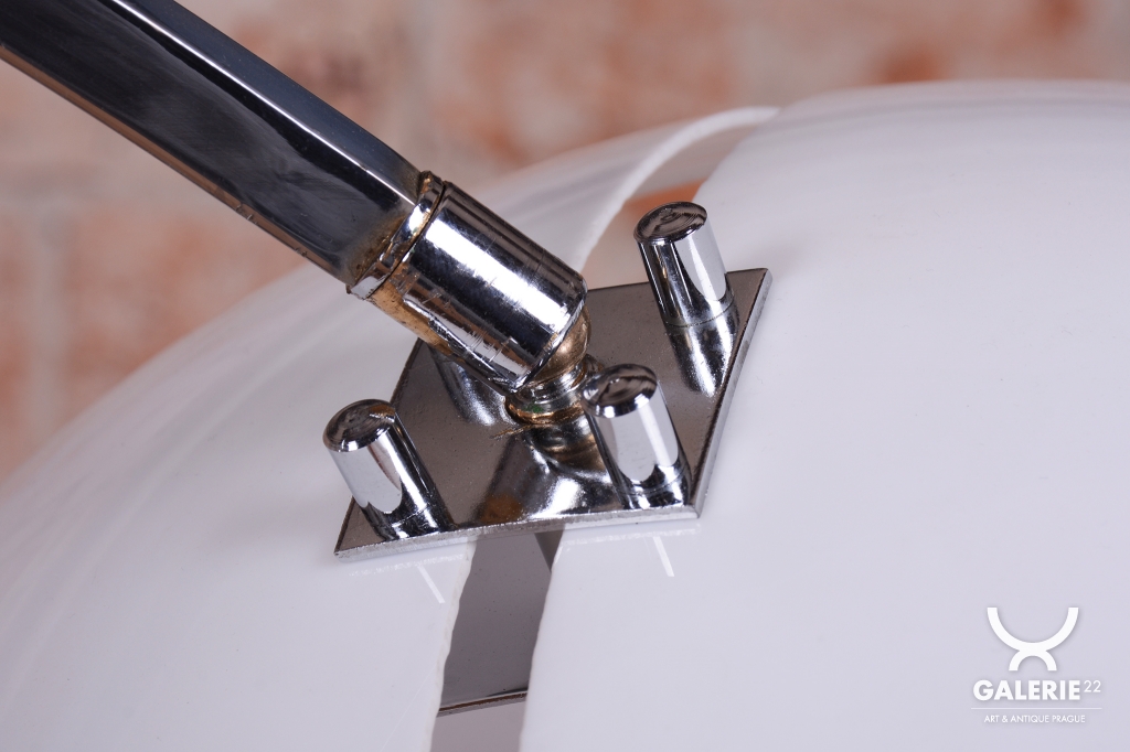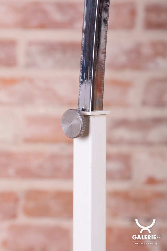 Svítidlo prošlo precizním restaurováním. Konstrukce z chromované oceli byla profesionálně vyčištěna a disponuje funkčním výsuvným ramenem, které umožňuje plynulé nastavení výšky svítidla podle potřeb interiéru. Výjimečnou stabilitu celého kusu zajišťuje velmi těžká mramorová základna, která tvoří luxusní protipól k lehkému polykarbonátovému stínidlu. Lampa má novou elektrifikaci, je plně funkční a připravena stát se designovou dominantou vašeho prostoru.
