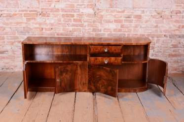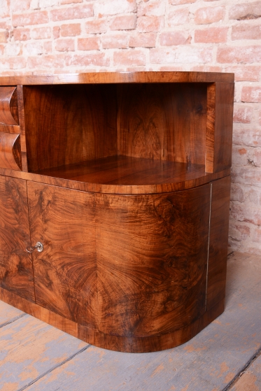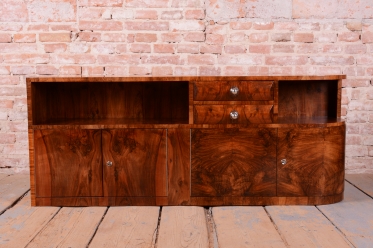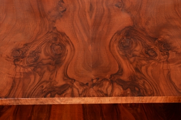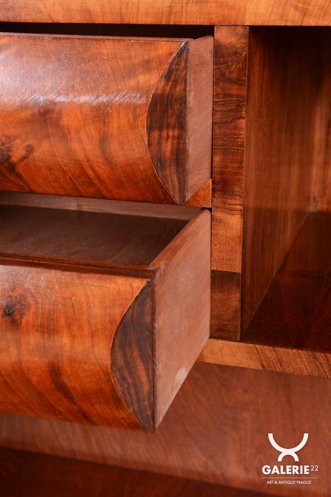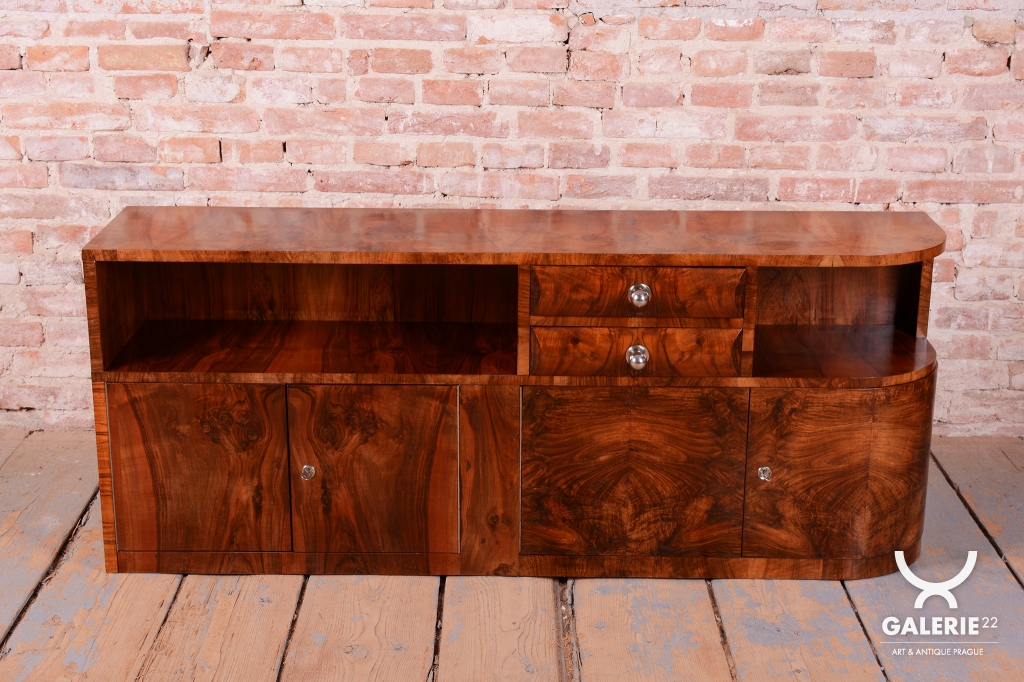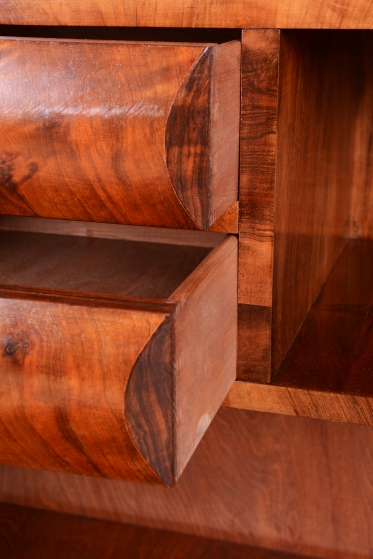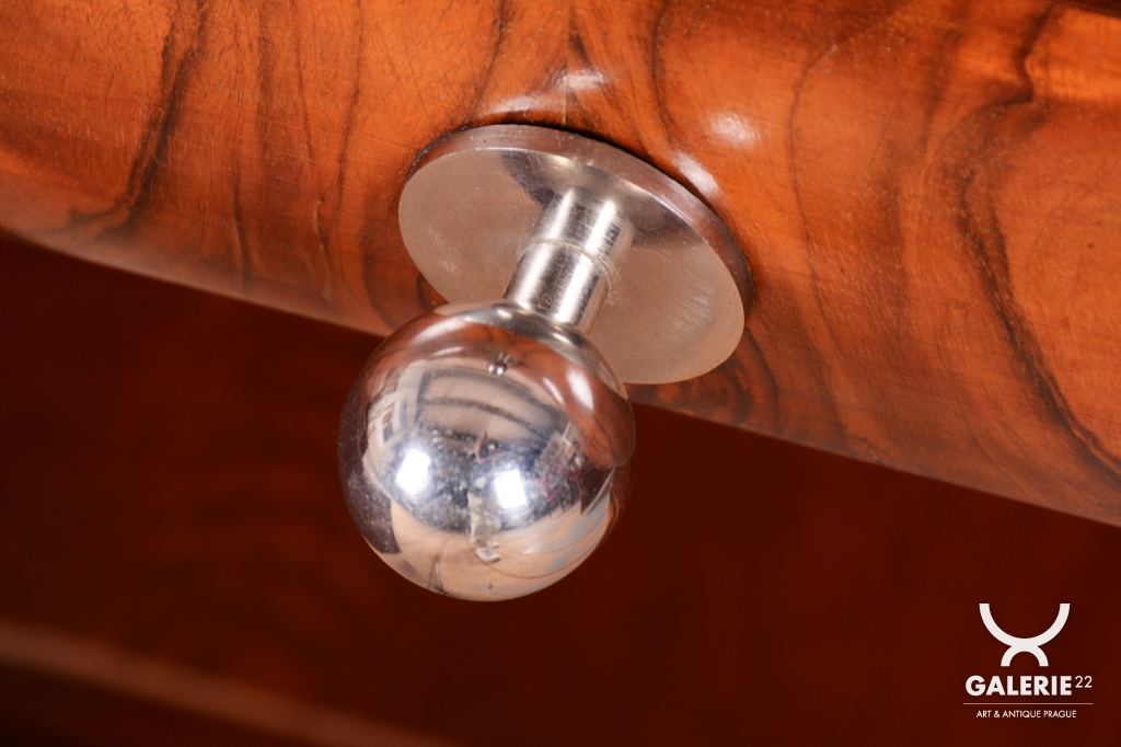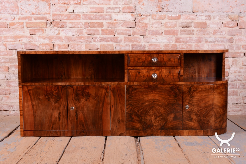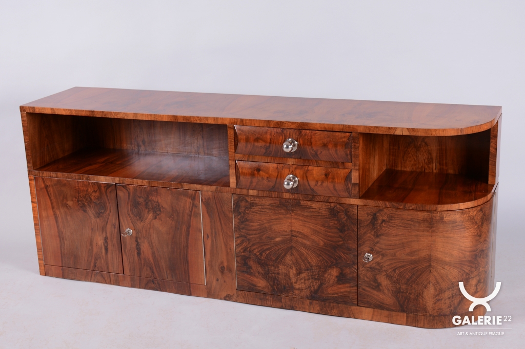 Předmět prošel kompletním restaurováním, které podtrhlo jeho výjimečnost. Konstrukce skříňky je vyrobena z kvalitní laťovky, která je dýhována vzácným kavkazským ořechem. Tato dřevina je vyhledávána pro svou dramatickou a bohatou kresbu, která pod oživenou původní politurou vytváří hluboké vizuální efekty. Modernistický nádech celku dodávají madla z chromované oceli, která tvoří čistý kontrast k přírodnímu dekoru dřeva. Bufet je plně funkční, nabízí velkorysý úložný prostor a je ve vynikajícím stavu.