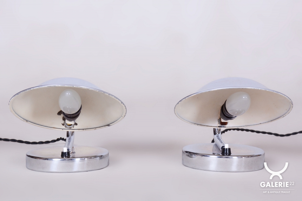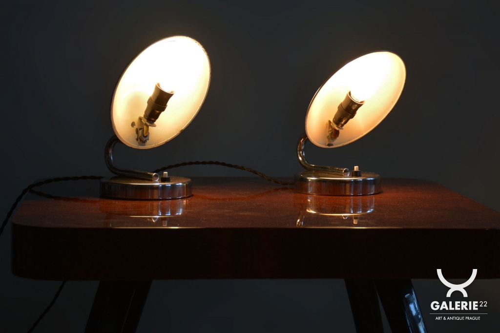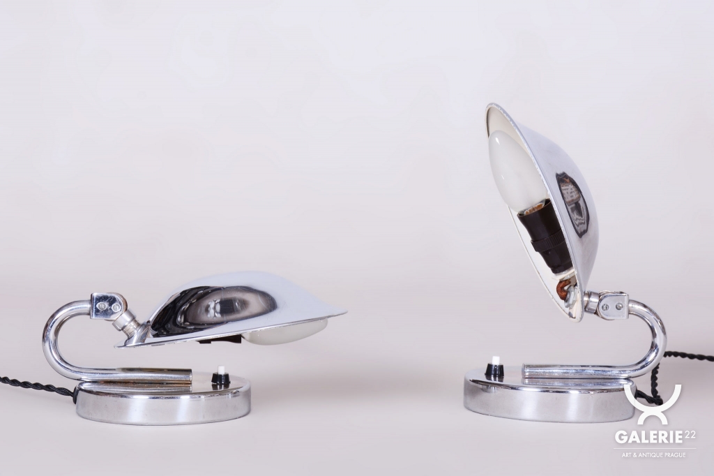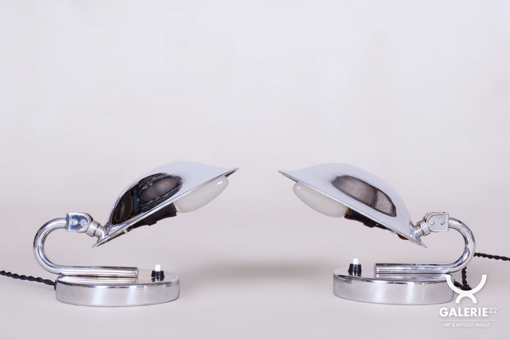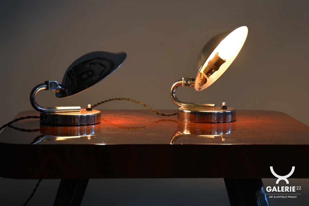 Tento pár stolních lampiček je vynikajícím příkladem progresivního československého designu počátku 20. století. Svítidla byla vyrobena renomovaným pražským podnikem Napako a svou estetikou stojí na pomezí dekorativního Art Deca a nastupujícího funkcionálního hnutí Bauhaus. Tato kombinace se projevuje v elegantních, ale přísně účelných liniích. Základem je konstrukce z chromované oceli, která byla v rámci restaurování profesionálně vyčištěna do zrcadlového lesku.
