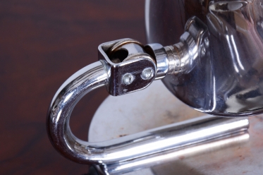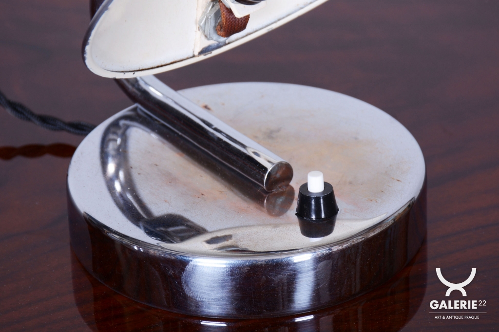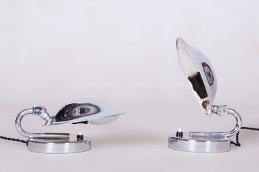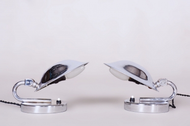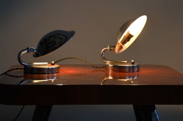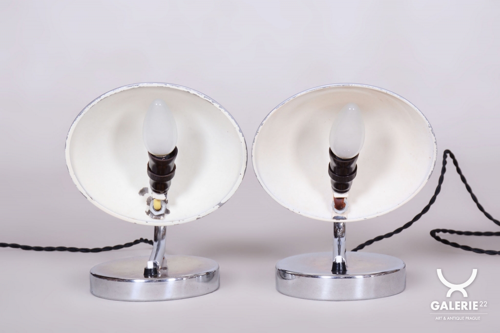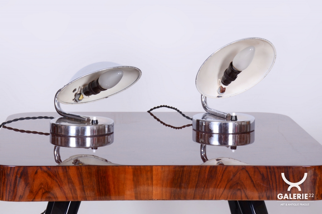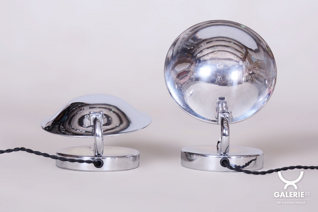 Tento pár stolních lampiček je vynikajícím příkladem progresivního československého designu počátku 20. století. Svítidla byla vyrobena renomovaným pražským podnikem Napako a svou estetikou stojí na pomezí dekorativního Art Deca a nastupujícího funkcionálního hnutí Bauhaus. Tato kombinace se projevuje v elegantních, ale přísně účelných liniích. Základem je konstrukce z chromované oceli, která byla v rámci restaurování profesionálně vyčištěna do zrcadlového lesku.