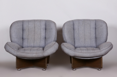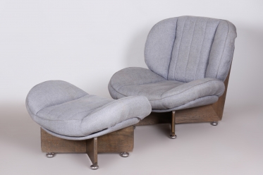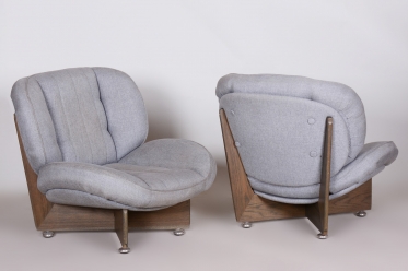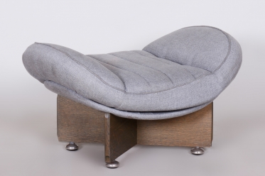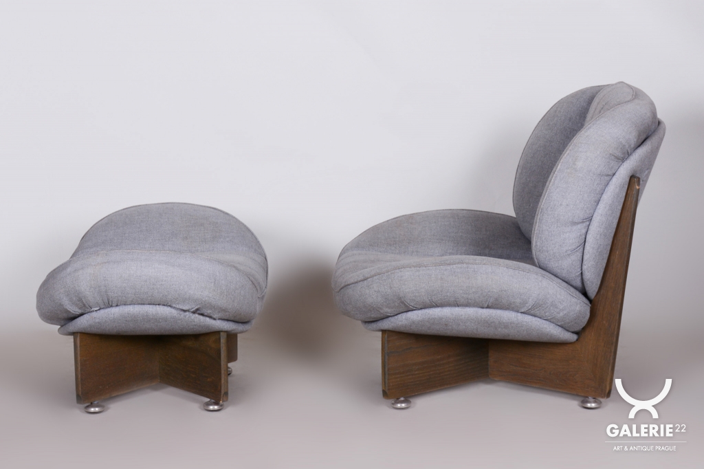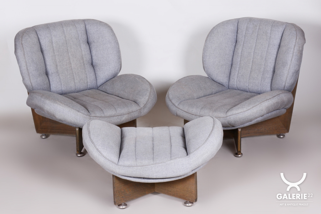 Tento pár křesel s taburetem představuje mimořádně vzácnou ukázku československého designu 60. let 20. století, která v sobě fascinujícím způsobem kombinuje futuristické vize éry Space Age s poctivým řemeslným zpracováním tradičních materiálů. Výrazně organické a zaoblené tvary hlubokých mušlovitých sedáků, známých jako lounge chairs, přímo vybízejí k hluboké relaxaci a vytvářejí v interiéru nepřehlédnutelný estetický prvek. Tento specifický styl definuje odvážné tvarosloví tehdejší doby, které se nebojí experimentovat s měkkostí linií a zároveň zachovává vysokou úroveň užitného komfortu pro náročného uživatele.