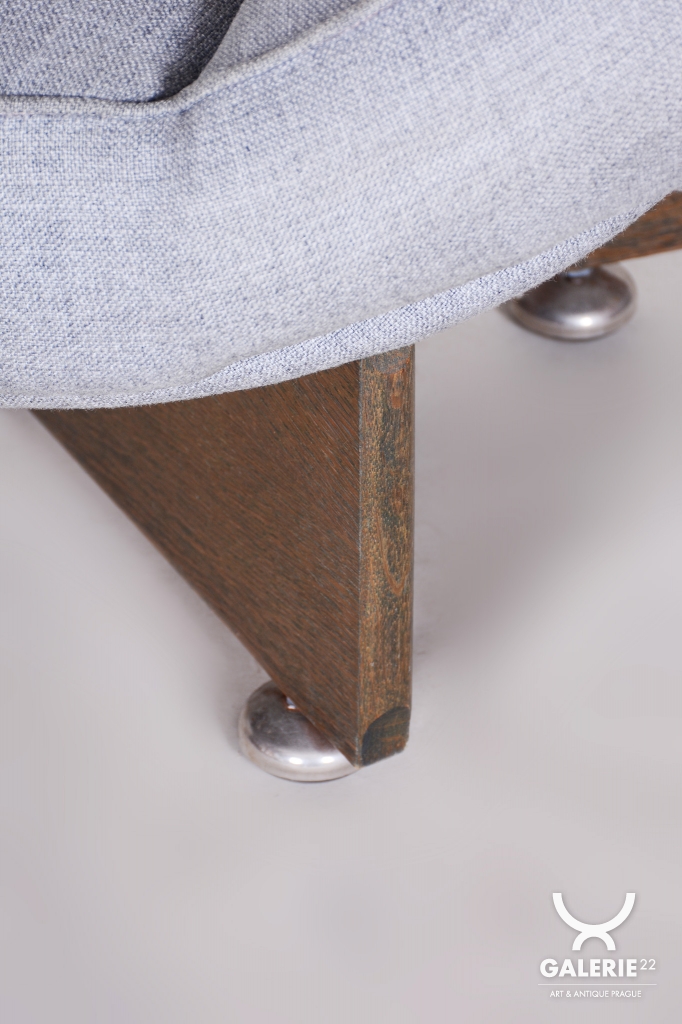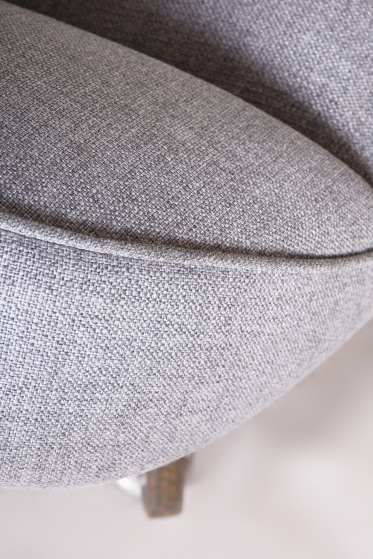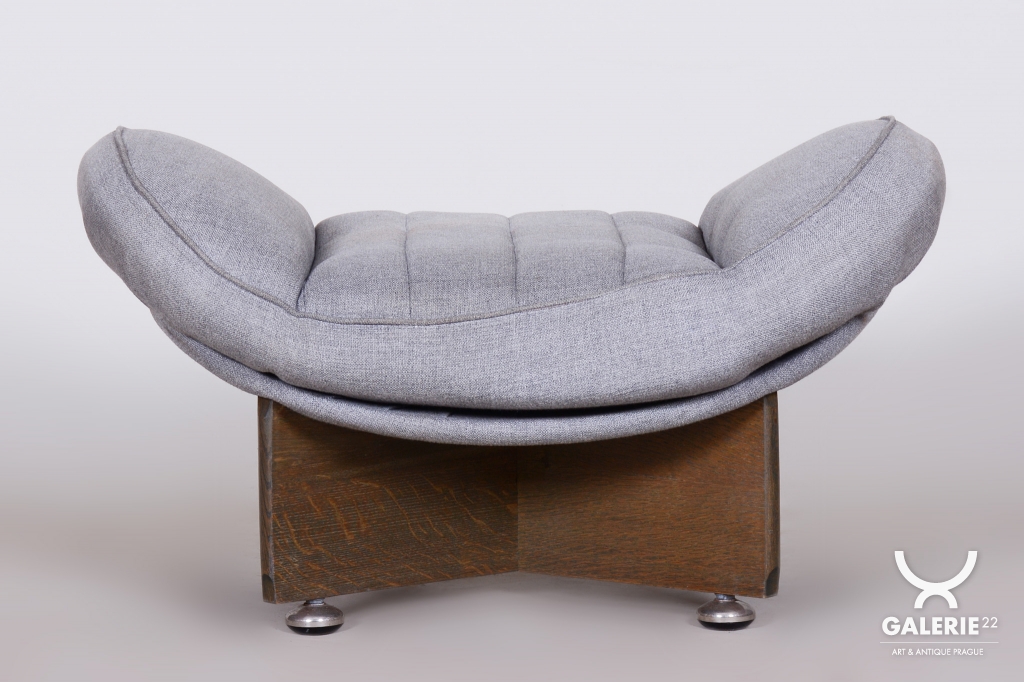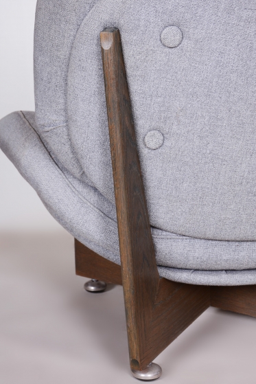 Naprostým unikátem u originálů z tohoto období je mimořádně zachovalý stav šedého čalounění, které prošlo pouze odborným šetrným čištěním. Textilie je opatřena výrazným svislým prošíváním, takzvaným buřtíkováním, které kromě estetické funkce plní i roli technickou, neboť pomáhá polstrování držet stálý tvar a výrazně zvyšuje výsledné pohodlí při sezení. Harmonický celek dotváří masivní dřevěná podnož ve tvaru kříže z mořeného dubu s oživenou politurou, jejíž výrazná kresba a pevnost dodávají setu nádech brutalistní moderny a zajišťují jeho dokonalou stabilitu.