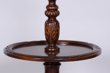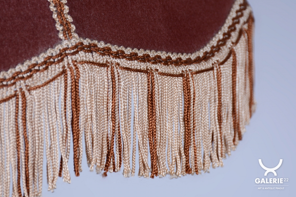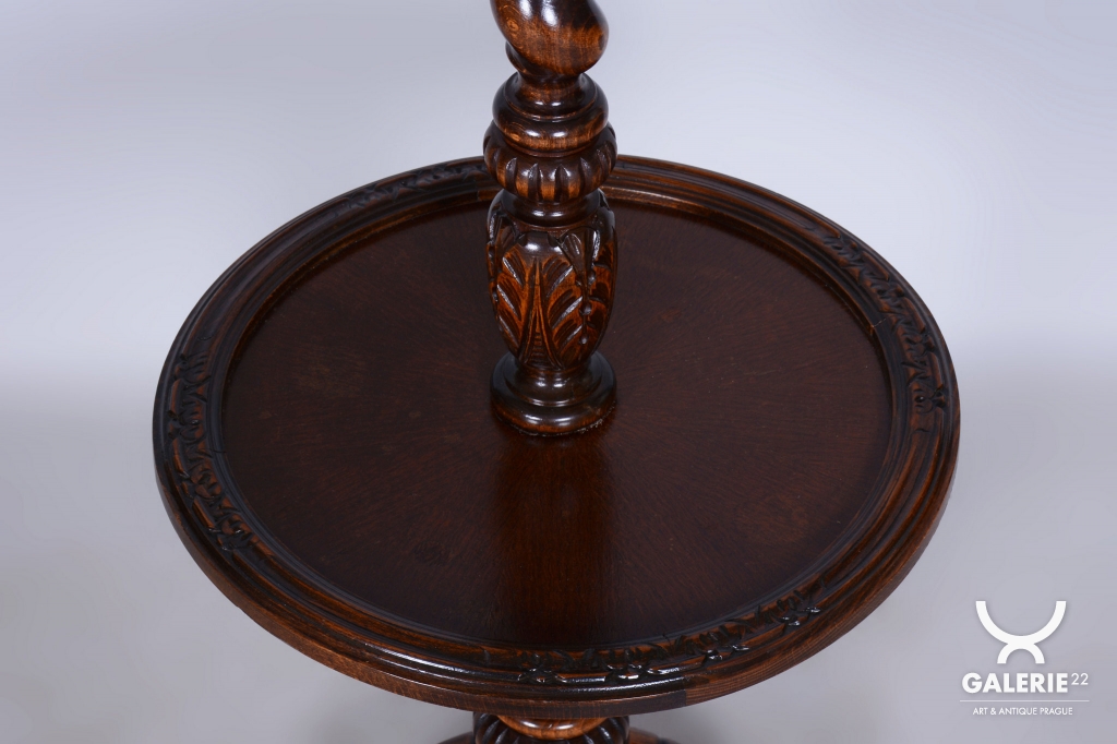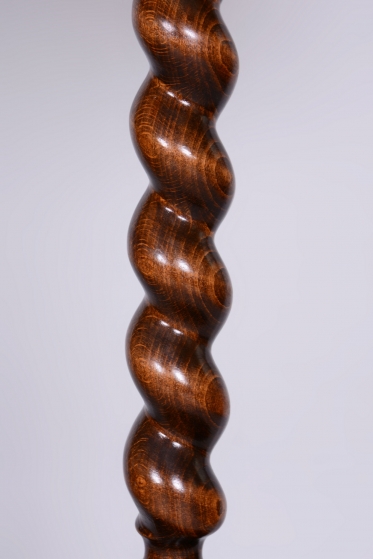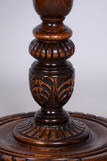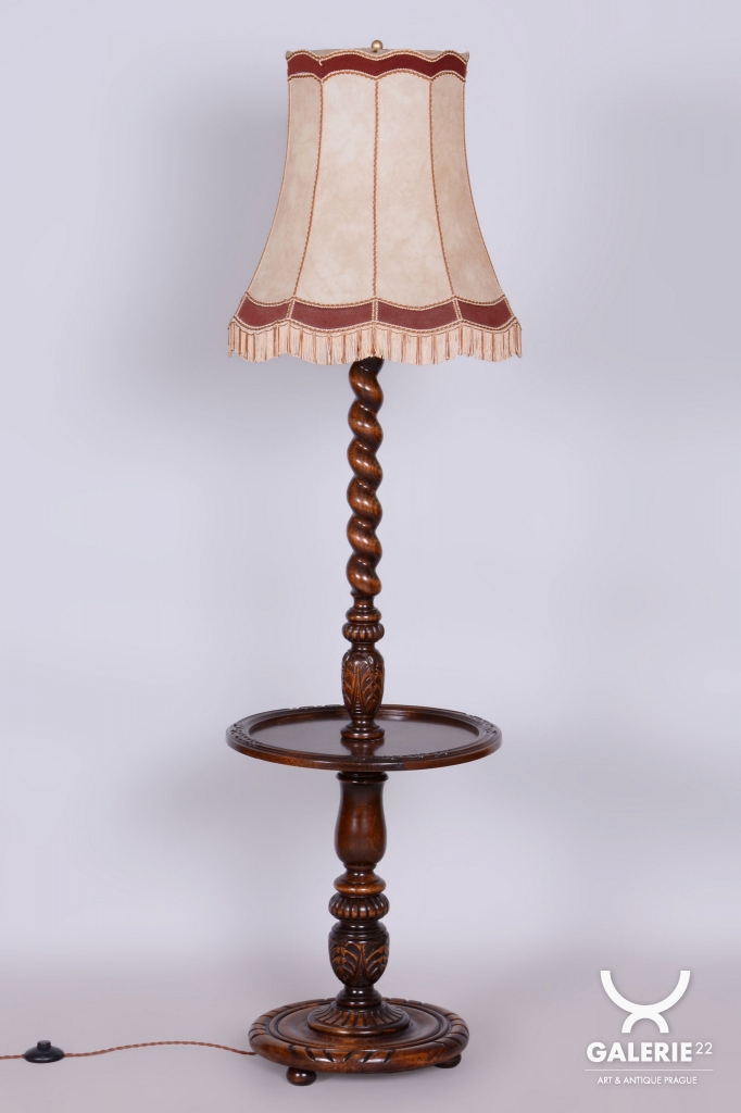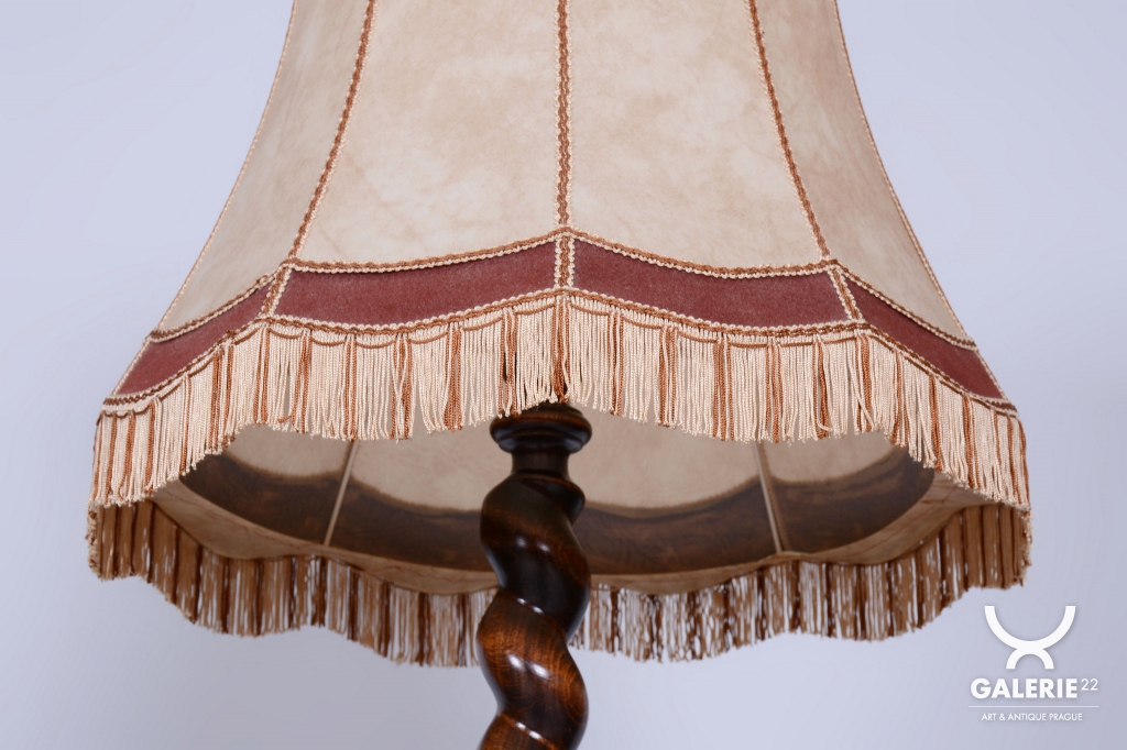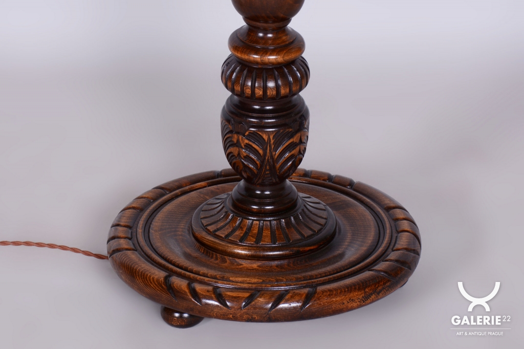 Podlahová lampa ve stylu Art Deco z počátku 20. století byla vyrobena v Československu. Konstrukce je z masivního dubu, odborně restaurovaná a ošetřená původní politurou, která obnovuje její autentický vzhled. Lampa prošla novou elektrifikací a její původní textilní stínidlo bylo profesionálně vyčištěno. Dřevěné tělo lampy je zdobeno tordovaným šroubením a řezbovanými ornamenty, které zvýrazňují jedinečné řemeslné zpracování.