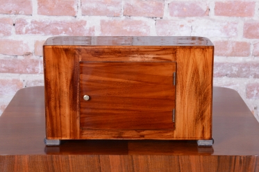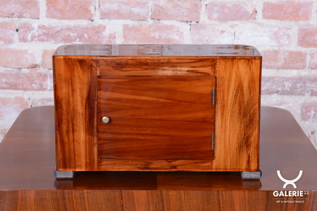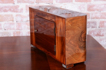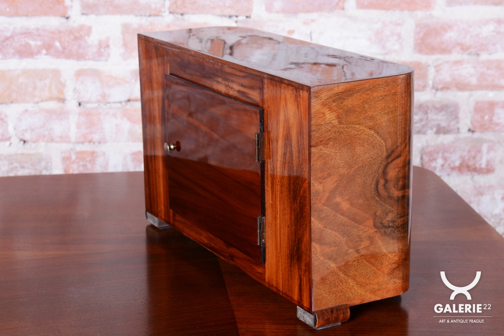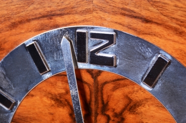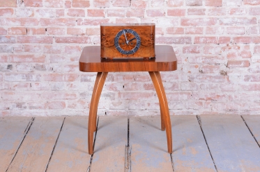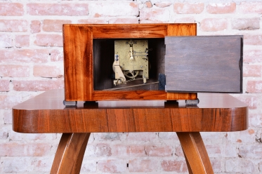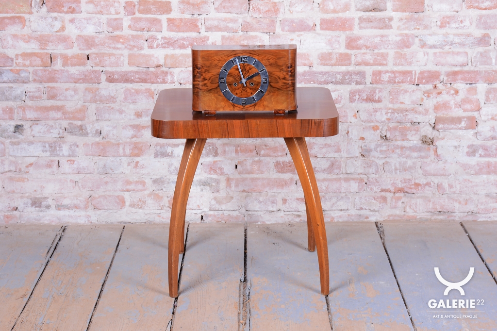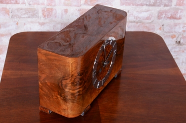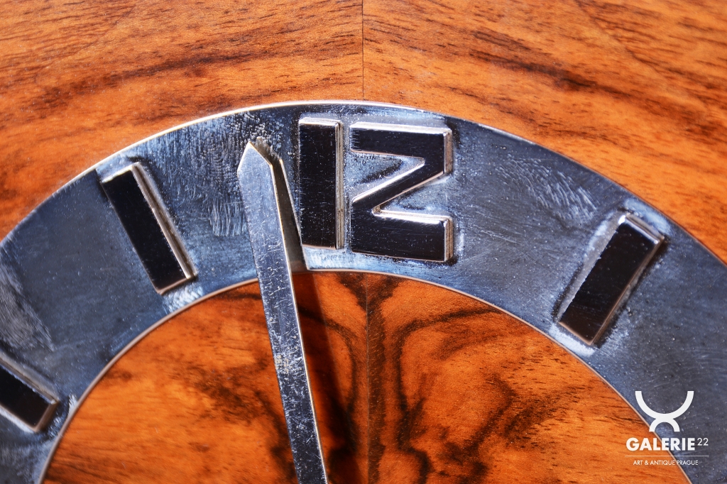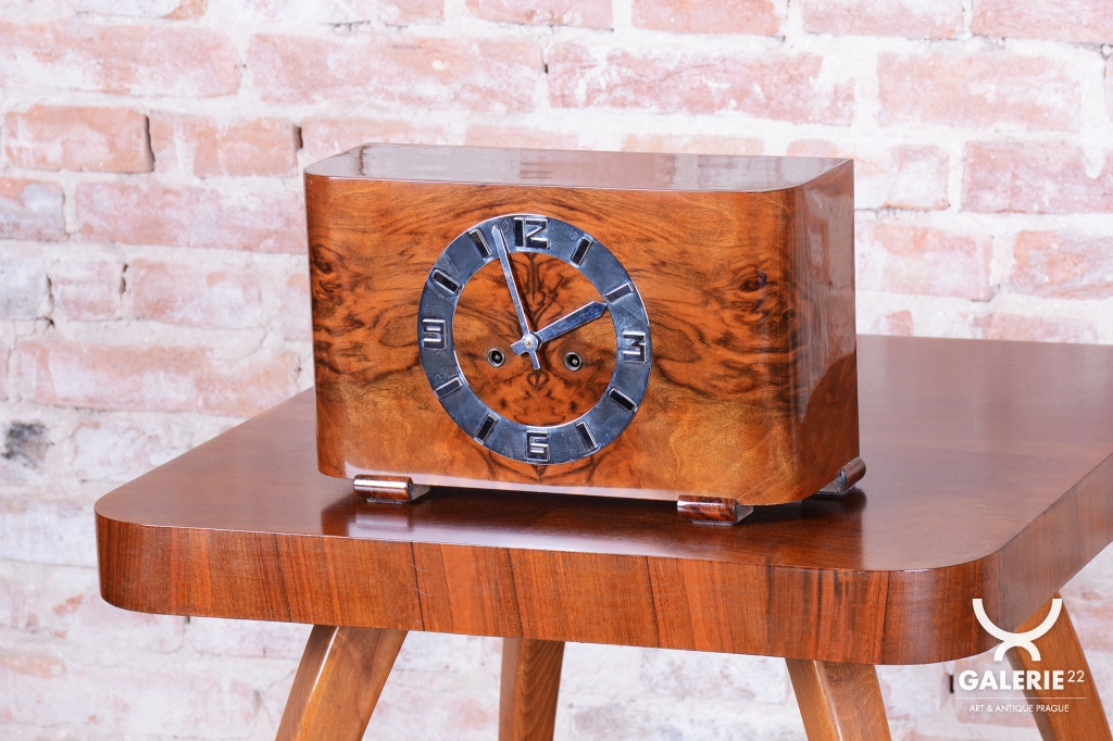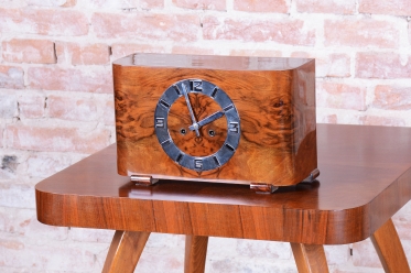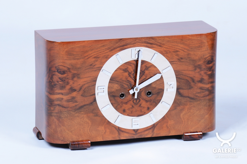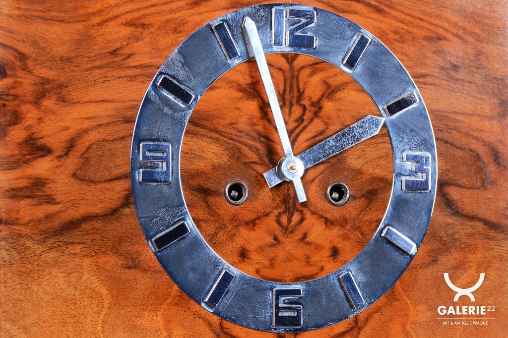 Tyto luxusní stolní hodiny jsou mistrovským kusem z období vrcholného Art Deca a pocházejí z 20. let 20. století z Československa. Představují dokonalé spojení precizního hodinářského řemesla a dekorativního umění, které bylo v meziválečném období v tuzemsku na světové úrovni. Hodinová skříň je vyrobena z ořechového dřeva, jehož kresba byla mistrovsky využita jako hlavní estetický prvek.