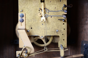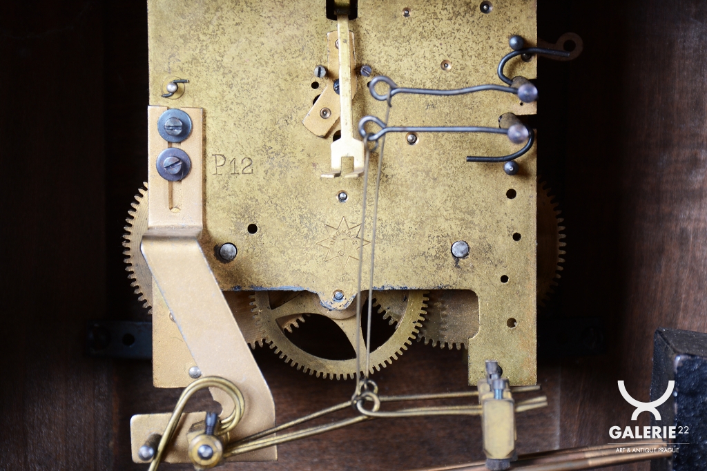 Povrch hodin prošel náročným procesem restaurování do vysokého lesku za použití pianového laku, který vytváří hluboký, zrcadlový efekt a dodává předmětu nebývalou noblesu. Srdcem hodin je plně funkční stroj se čtvrťovým bitím, což znamená, že hodiny melodicky ohlašují každou čtvrthodinu, což byla výsada jen těch nejkvalitnějších a nejdražších modelů své doby. Díky svému dynamickému tvarosloví a preciznímu provedení jsou tyto hodiny nejen praktickým ukazatelem času, ale především dominantním uměleckým solitérem pro náročného sběratele.