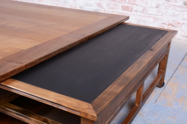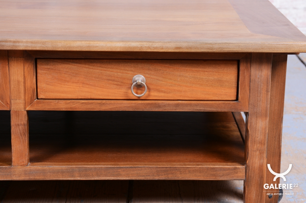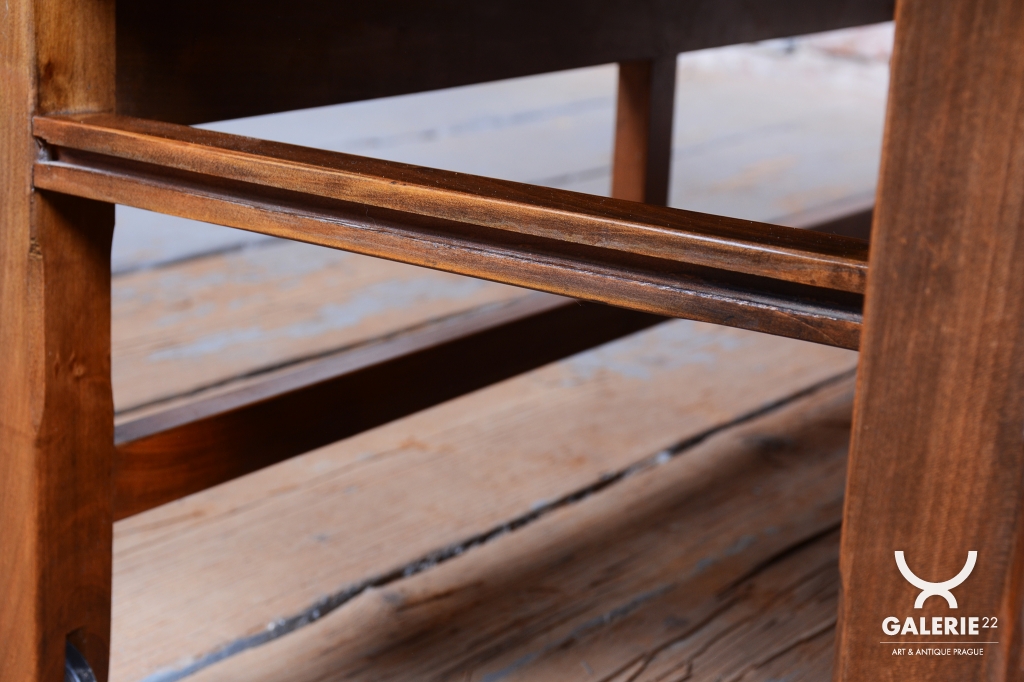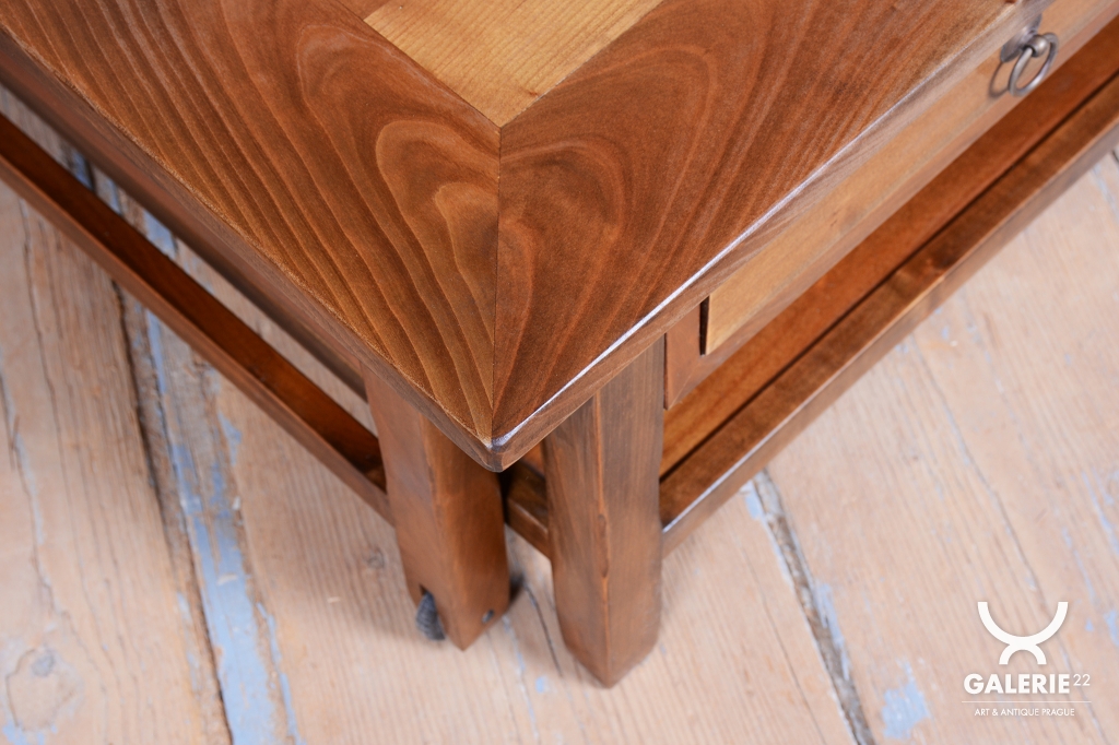 Stůl je zhotoven z třešňového masivu, což mu propůjčuje krásnou, hlubokou barvu a ušlechtilý vzhled. Prošel pečlivou renovací, během níž byla oživená původní politura, která podtrhuje autenticitu a přirozenou krásu dřeva.