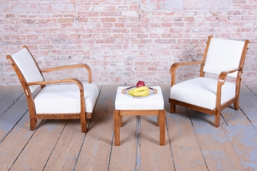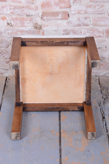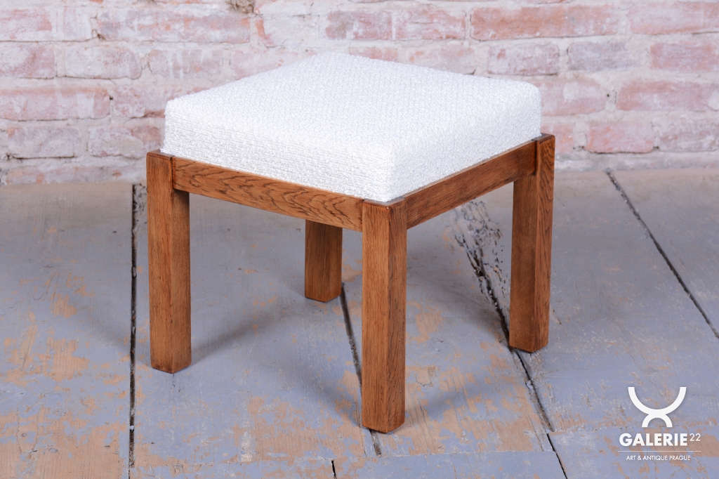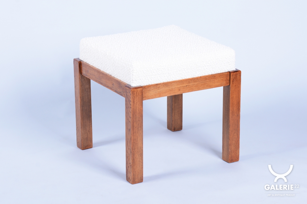 Předmět prošel kompletním restaurováním. Stabilní konstrukce z masivního dubu byla ošetřena a původní politura dřeva byla citlivě oživena, díky čemuž vynikla přirozená kresba dubového masivu. Taburet byl nově profesionálně čalouněn podle původní předlohy. Díky své pevnosti a nadčasovému vzhledu najde využití jako samostatný prvek v předsíni, ložnici nebo jako stylová podnožka k oblíbenému křeslu.