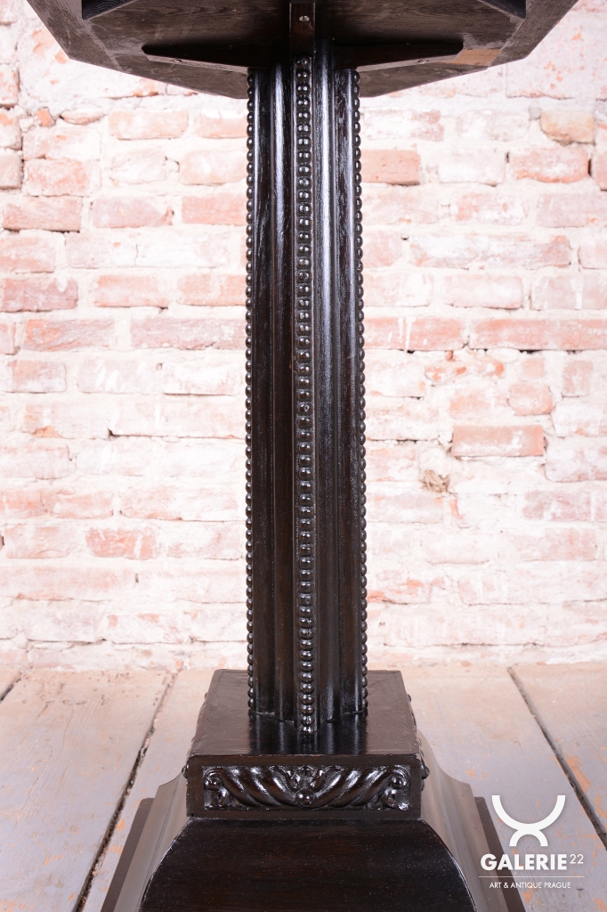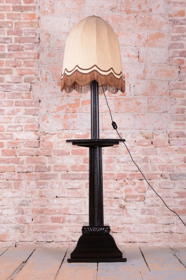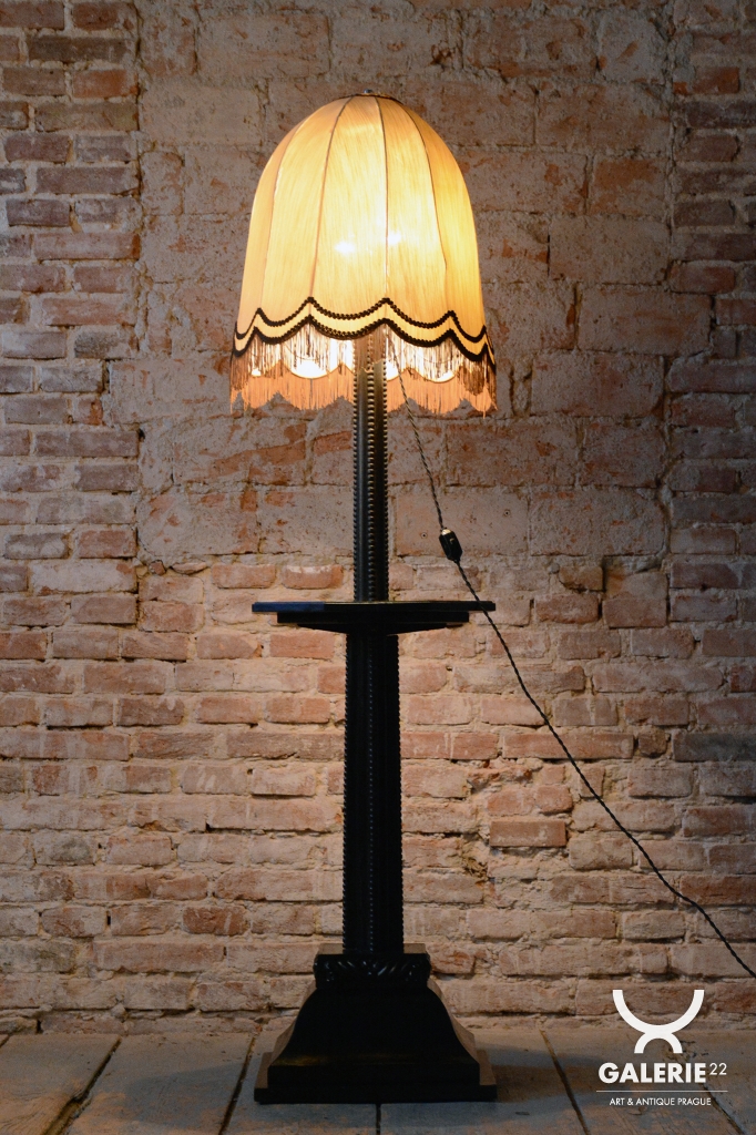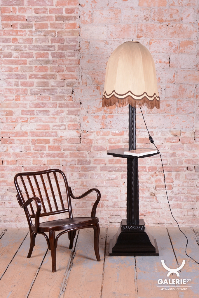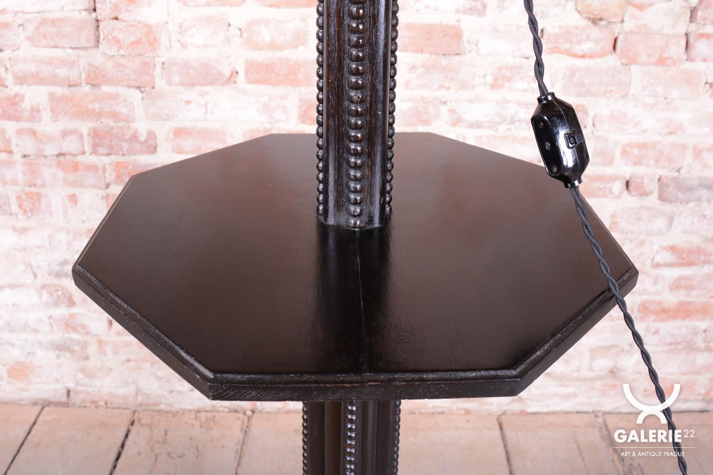 Tato elegantní podlahová lampa je vynikajícím příkladem stylu Art Deco z Československa 20. let 20. století. Konstrukce je vyrobena z kombinace kvalitního bukového a dubového dřeva. Dominantu tvoří původní textilní stínidlo, které bylo odborně vyčištěno a zachovává si svůj historický charakter.