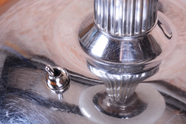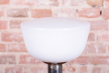 Konstrukce lampy je zhotovena z chromované oceli, kterou doplňuje minimalistické stínidlo z bílého opálového skla. Předmět prošel kompletním restaurováním, které zahrnovalo profesionální vyčištění chromových částí a instalaci nové elektrifikace. Lampa je plně funkční a díky svému nadčasovému geometrickému designu se skvěle hodí do moderních i klasických interiérů.