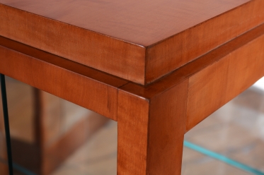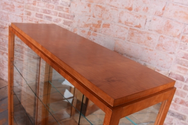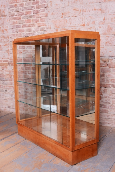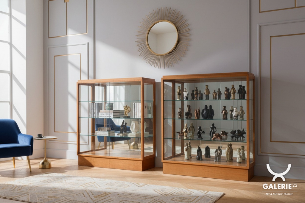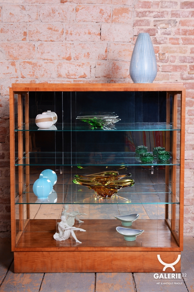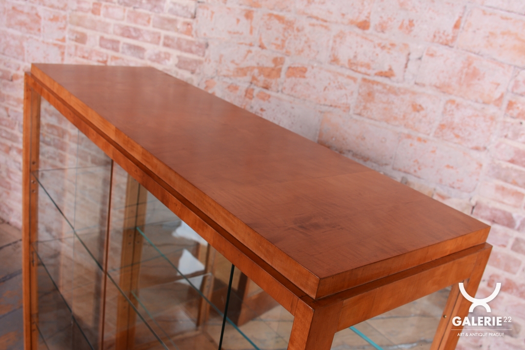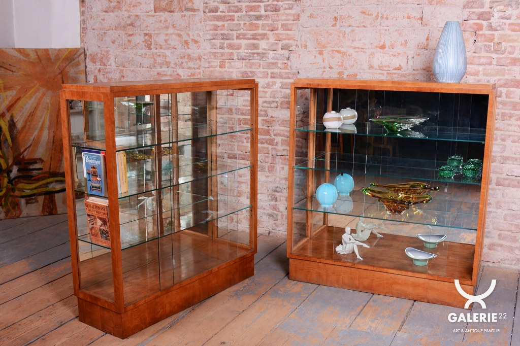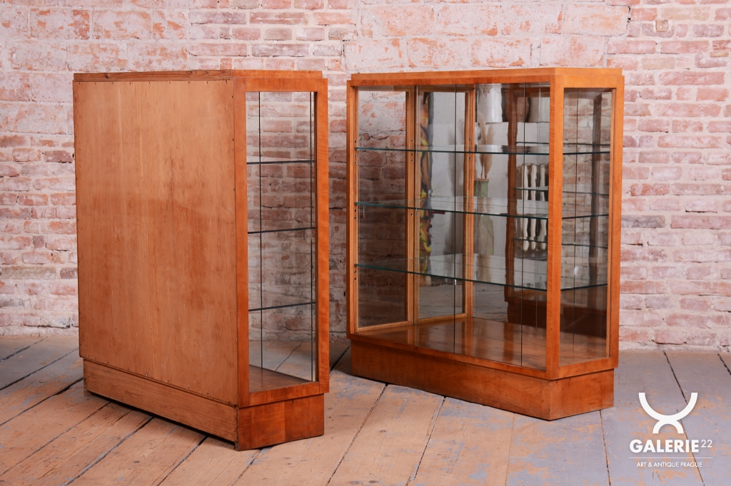 Tento výjimečný pár prosklených vitrín představuje luxusní ukázku nábytkového designu z období Art Deco, vyrobený v Československu ve 30. letech 20. století. Skříňky jsou dýhovány javorem, jehož světlá barva a jemná kresba dodávají celému souboru mimořádně elegantní a vzdušný vzhled, který byl v této éře velmi ceněn pro svou modernost. V rámci odborného restaurování byla citlivě oživena původní politura dřeva, což navrátilo povrchu jeho přirozenou hloubku a hedvábný lesk.