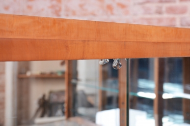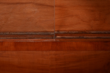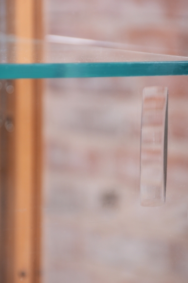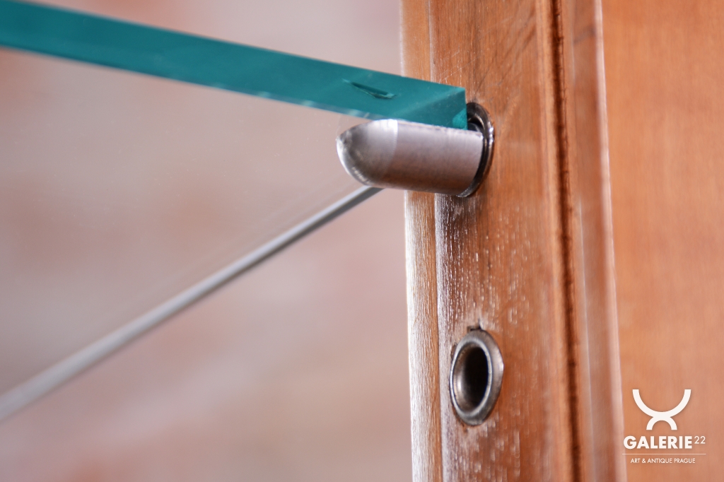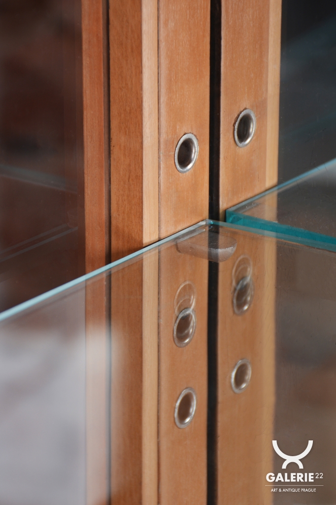 Horní výstavní část každé vitríny je tvořena čirým sklem, které umožňuje nerušený pohled na vystavené sběratelské předměty. Zadní strany vitrín jsou osazeny zrcadly, která byla profesionálně vyčištěna a opticky zvětšují vnitřní prostor i celou místnost, přičemž dodávají vystaveným předmětům další rozměr díky odrazům světla. Spodní uzavřené části poskytují praktický úložný prostor a jsou zdobeny geometrickým uspořádáním dýhy, typickým pro vytříbený vkus první republiky.