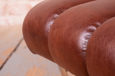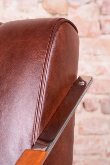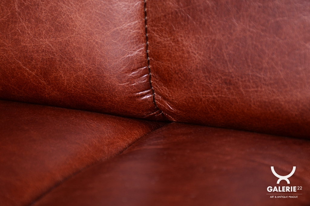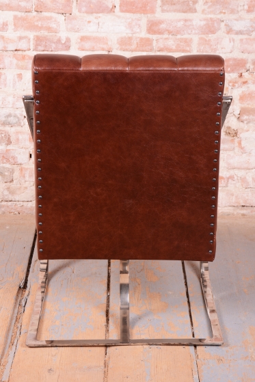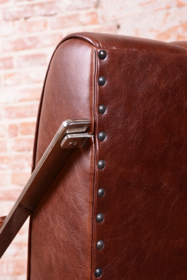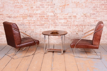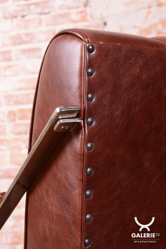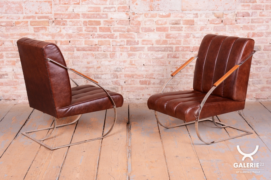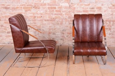 Tento restaurovaný pár křesel představuje jedinečnou kombinaci materiálů a designu. Původní tradiční čalounění bylo odborně opraveno, čímž zůstala zachována autenticita a křesla jsou pohodlná, bez prosezení. Rám je vyroben z niklované oceli, sedadla a opěradla jsou potažena pravou kůží a elegantní dubové područky dodávají nábytku příjemný kontrast.