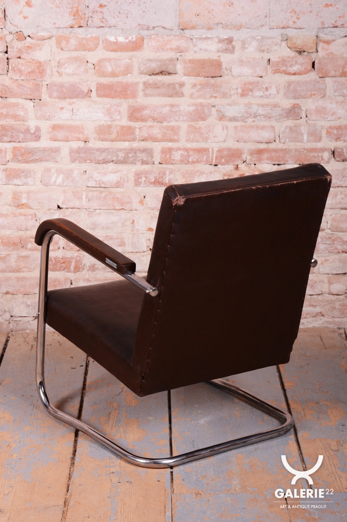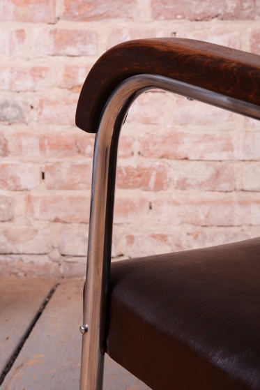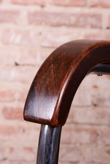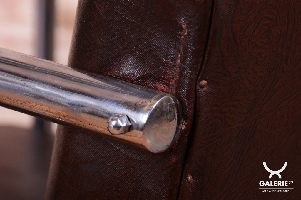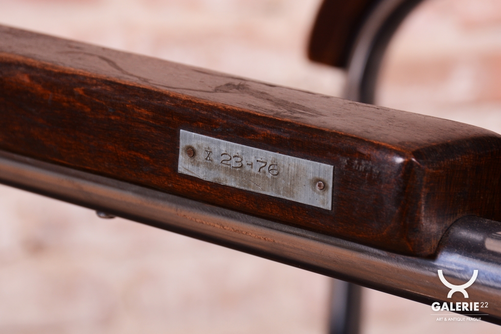 Naprostým unikátem je stav zachování – křesla mají původní koženku, která je ve výjimečně dobrém stavu, a původní tradiční čalounění, které je pevné a neprosezené. Tento nálezový stav s vysokou mírou autenticity je mezi sběrateli velmi ceněný. Dynamický vzhled doplňují područky z bukového masivu, u nichž byla v rámci restaurování oživená původní politura, která dřevu navrátila hloubku a kontrast k chladnému chromu. Tato křesla jsou nejen ikonickým kusem nábytku, ale i skvělou investicí do historie světového designu.