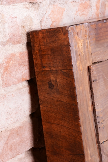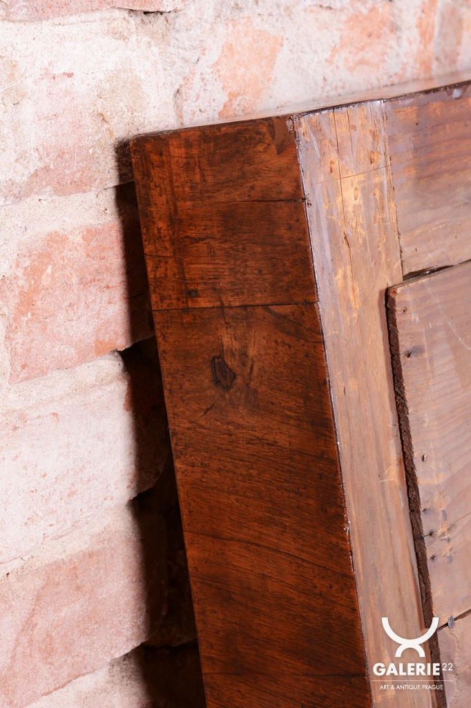 Mimořádnou dekorativní hodnotu zrcadlu dodávají řezbované zlacené lišty, které lemují vnitřní i vnější obvod rámu. Tyto jemné detaily v kombinaci s tmavým dřevem vytvářejí kontrast, který byl pro rakouský empír velmi typický. Velmi cenným prvkem je původní zrcadlo, které je opatřeno fazetou. Původní sklo po obvodu láme světlo a umocňuje luxusní vzhled i historickou autenticitu celého kusu. V rámci profesionálního restaurování byla citlivě oživená původní politura dřeva, což navrátilo rámu jeho hedvábný lesk a zvýraznilo kontrast se zlacenými prvky.