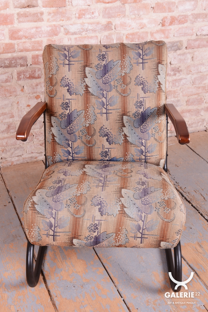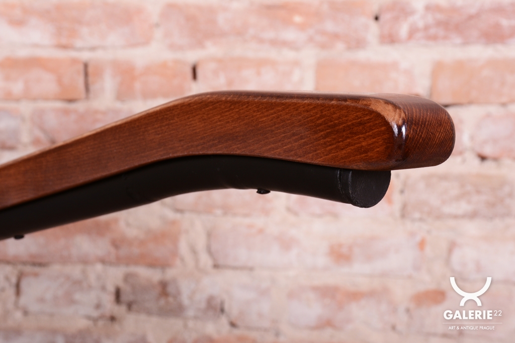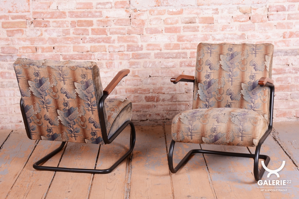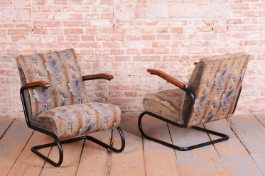Tento výjimečný pár křesel představuje ikonický design éry Bauhausu a pochází z 30. let 20. století v Československu. Křesla jsou postavena na konstrukci z lakované pružné ocelové trubky, která definovala moderní modernismus a přinesla do interiérů lehkost a dynamiku. Výrazným detailem jsou područky z masivního buku, jejichž zaoblený tvar harmonicky doplňuje přísné linie kovového rámu.