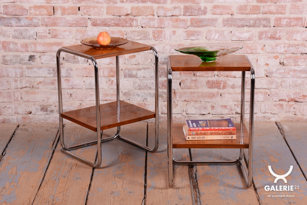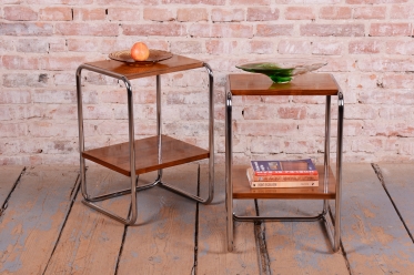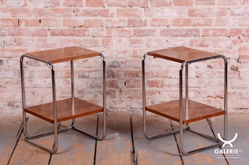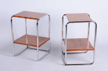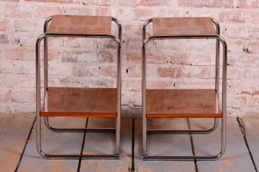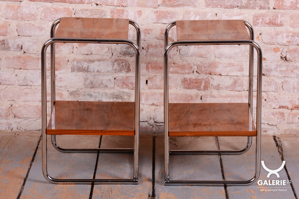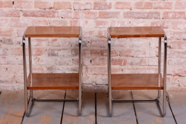 Tento výjimečný pár nočních stolků (model T29) je mistrovským dílem moderní architektury a designu. Navrhl je jeden z nejvýznamnějších představitelů školy Bauhaus, architekt Marcel Breuer, pro legendární firmu Thonet. Stolky pocházejí z 20. let 20. století z Německa a představují revoluční využití průmyslových materiálů v bytovém interiéru. Subtilní, ale vysoce stabilní konstrukce z trubkové chromované oceli byla v rámci restaurování profesionálně vyčištěna, aby vynikl její čistý geometrický tvar.