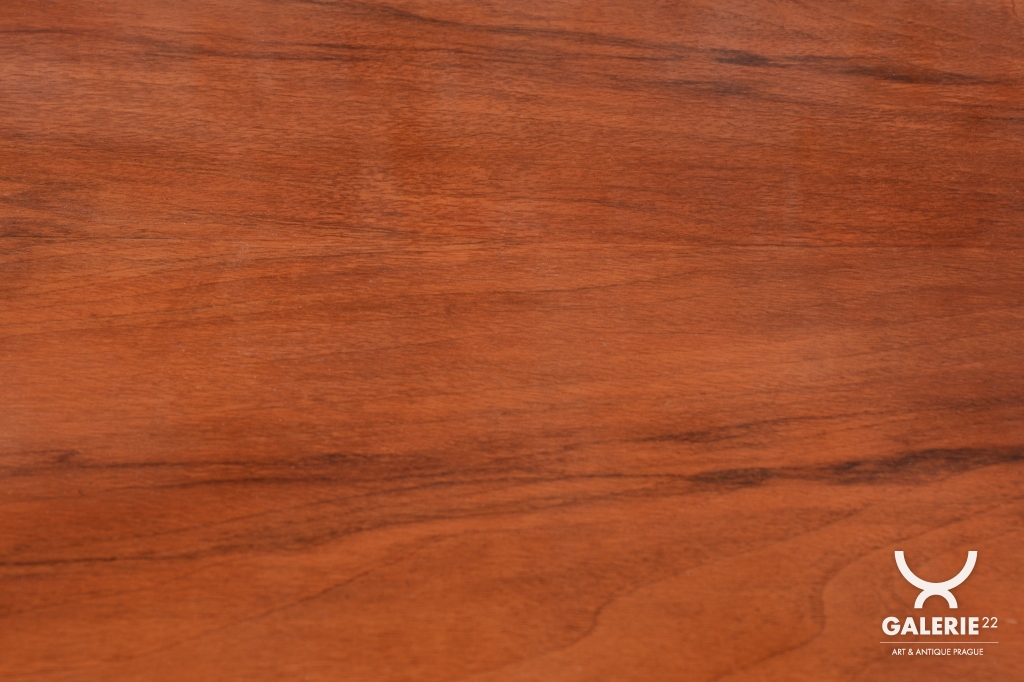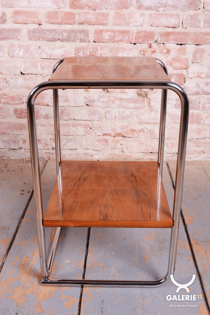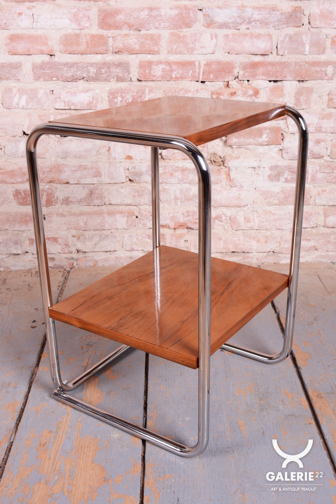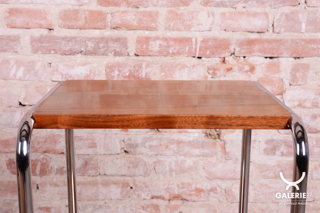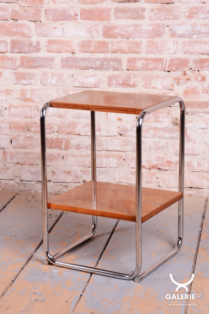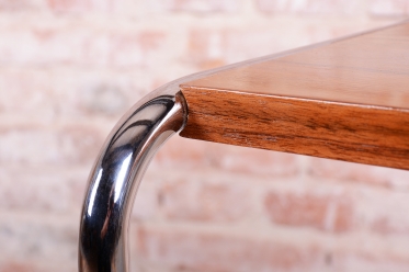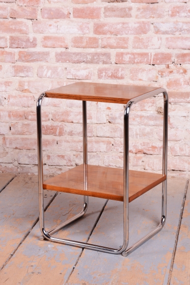 Odkládací plochy tvoří dvě poličky vyrobené z laťovky dýhované ořechem. Výrazná a ušlechtilá kresba ořechového dřeva vytváří dokonalý vizuální kontrast k chladnému povrchu chromu. Během odborného restaurování byla citlivě oživená původní politura dřeva, což navrátilo povrchům hloubku a hedvábný lesk. Stolky jsou plně funkční a díky svému nadčasovému minimalismu a otevřené, vzdušné konstrukci se řadí k nejikoničtějším kusům nábytku 20. století. Pro sběratele se jedná o vzácnou příležitost získat autentický pár od jednoho z otců modernismu.