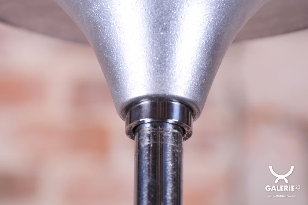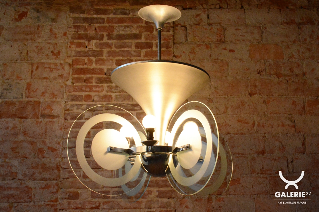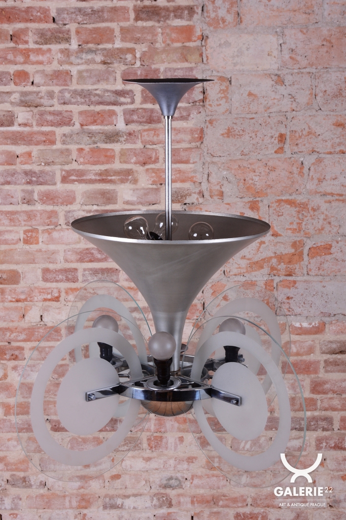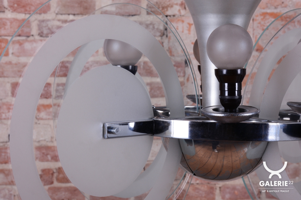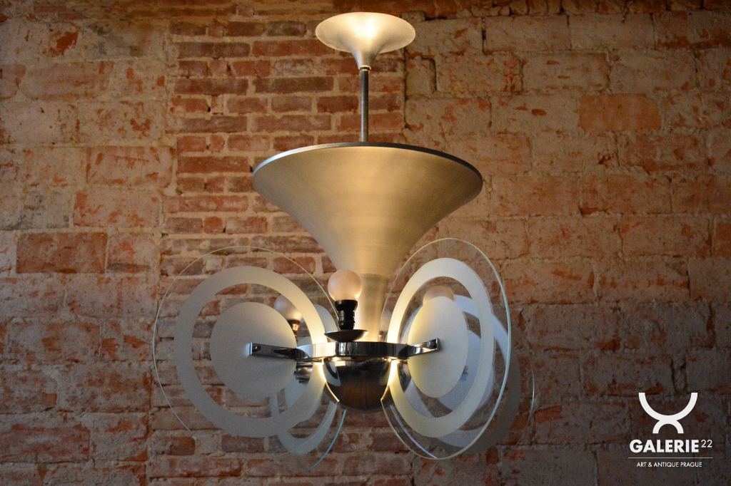 Tento výjimečný lustr je autentickým dílem jednoho z nejvýznamnějších českých návrhářů svítidel, architekta Franty Anýže. Pochází z 30. let 20. století a představuje esenci Bauhausu – funkční estetiku, která sází na technickou dokonalost a geometrickou čistotu. Konstrukce z chromované oceli v kombinaci s lakovanými prvky prošla profesionálním vyčištěním, které navrátilo kovovým částem jejich původní vysoký lesk a svěží vzhled.