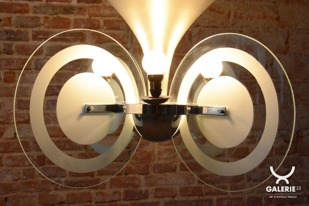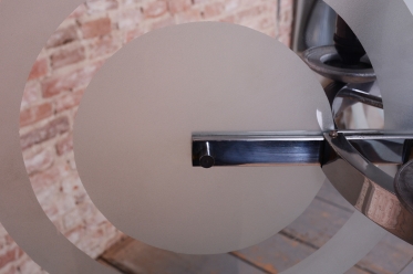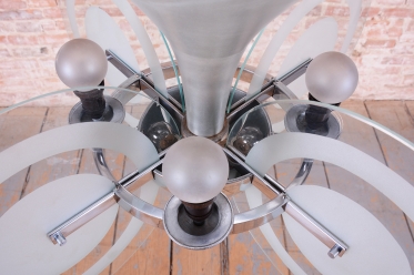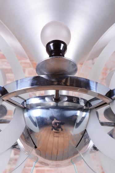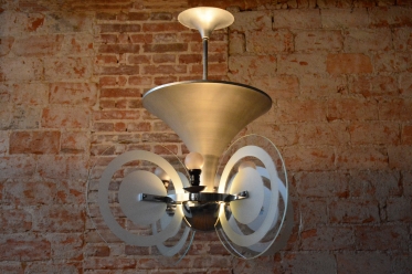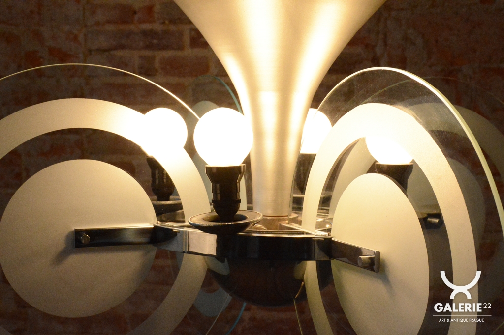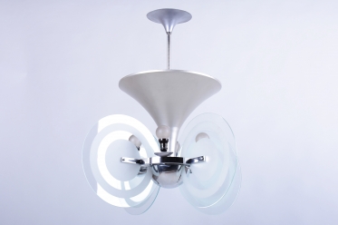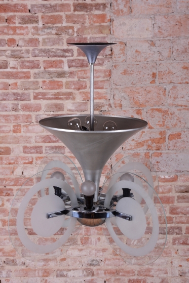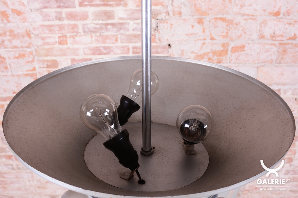 Tento výjimečný lustr je autentickým dílem jednoho z nejvýznamnějších českých návrhářů svítidel, architekta Franty Anýže. Pochází z 30. let 20. století a představuje esenci Bauhausu – funkční estetiku, která sází na technickou dokonalost a geometrickou čistotu. Konstrukce z chromované oceli v kombinaci s lakovanými prvky prošla profesionálním vyčištěním, které navrátilo kovovým částem jejich původní vysoký lesk a svěží vzhled.