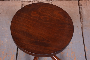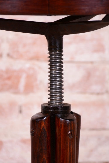 Předmět prošel odborným restaurováním, při kterém byla citlivě oživena původní politura. Konstrukce je vyrobena z bukového masivu, zatímco kruhový sedák tvoří buková překližka. Zcela zásadním prvkem je původní ocelový mechanizmus, který umožňuje plynulé nastavení výšky sedáku pouhým točením kolem své osy. Mechanika je plně funkční, stabilní a připravená k dennímu užívání.