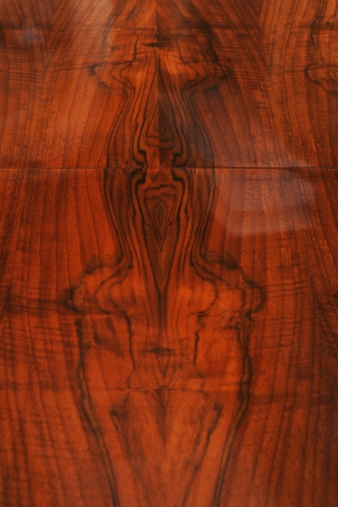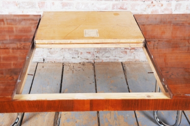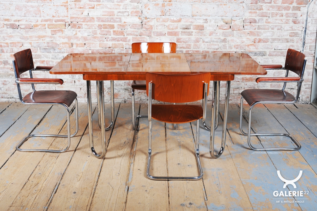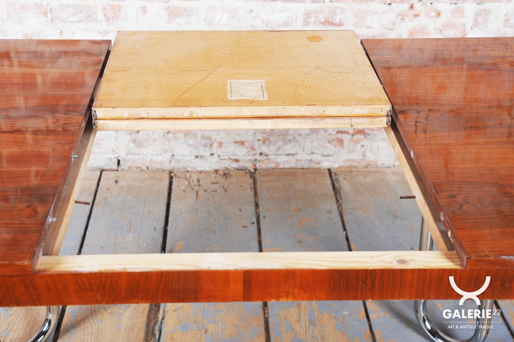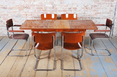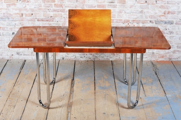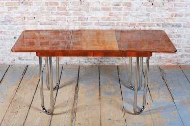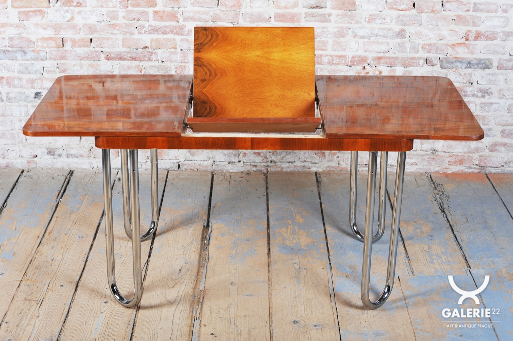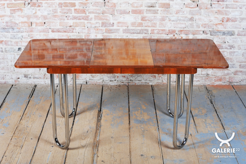 Tento jídelní stůl z počátku 20. století se nachází na pomezí stylů Art Deco a Bauhaus, což mu dodává jedinečný charakter. Navržen Jindřichem Halabalou a vyroben UP Závody, spojuje eleganci ořechové dýhy s industriální estetikou trubkové chromované oceli. Pečlivá renovace vrátila dřevu jeho původní lesk a chromové prvky byly profesionálně vyčištěny, aby opět zářily v plné kráse.