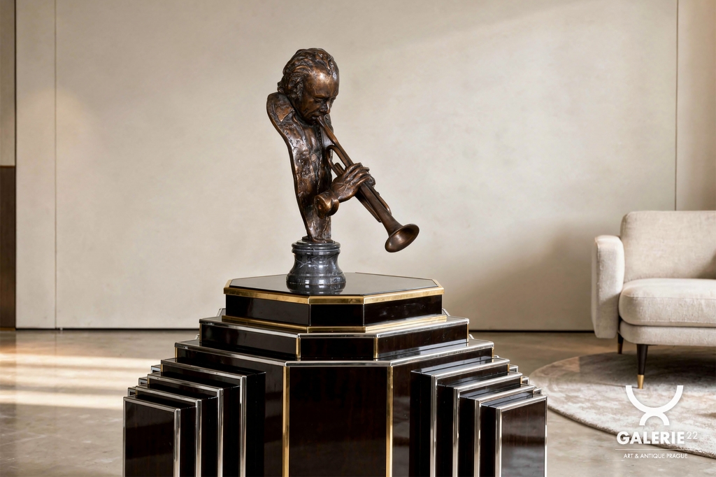 Tato bronzová socha trumpetisty, ztvárňující legendárního Milese Davise, je fascinujícím spojením hudebního génia a estetiky pozdního Art Deca 30. let. Přestože je autor neznámý, dílo vykazuje mimořádnou dynamiku a stylizaci, která je pro toto období typická – zachycuje hudebníka v momentě naprostého soustředění a virtuozity. Socha je v původním, perfektně zachovalém stavu a je upevněna na elegantním mramorovém podstavci, který podtrhuje její sběratelskou hodnotu.